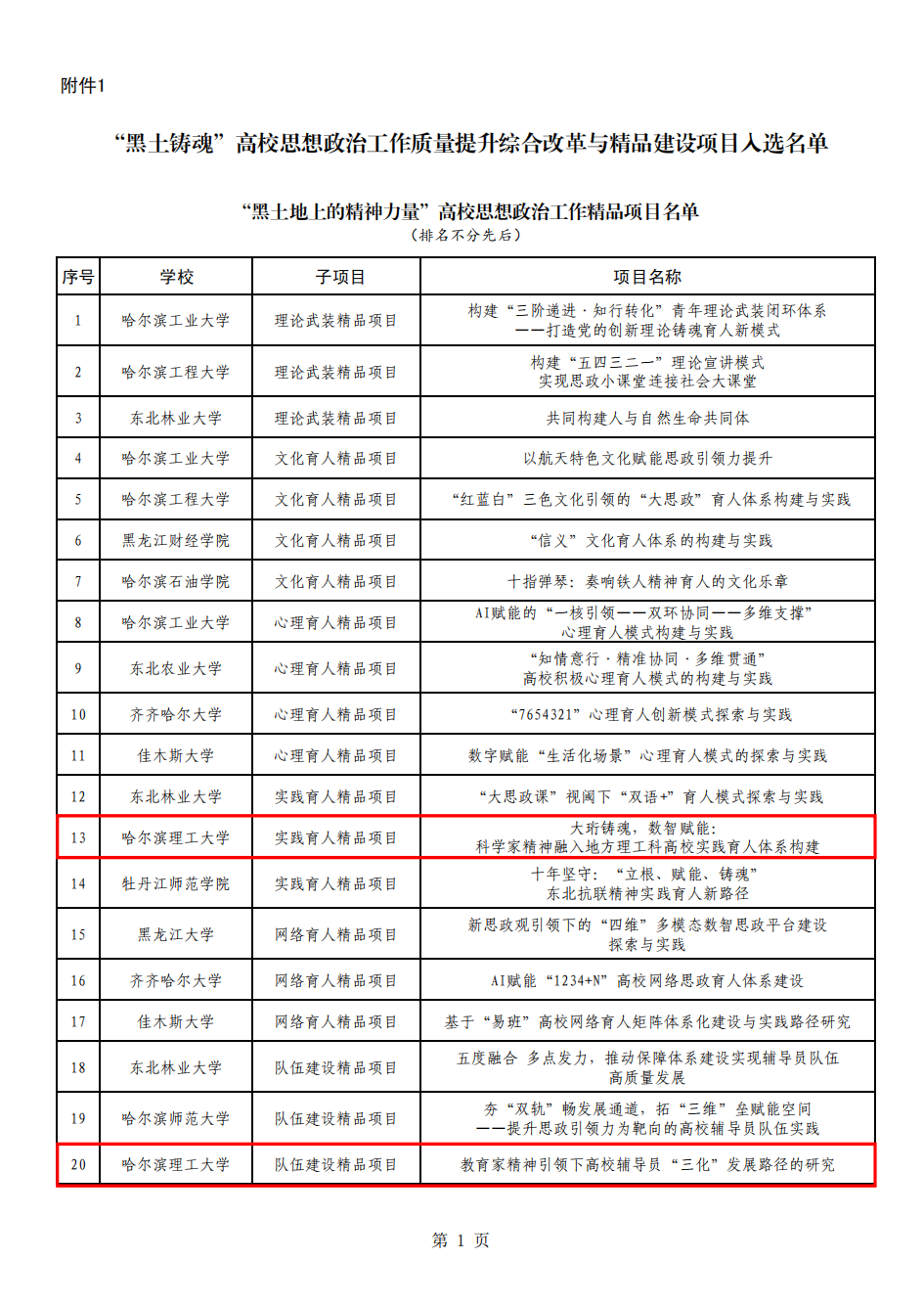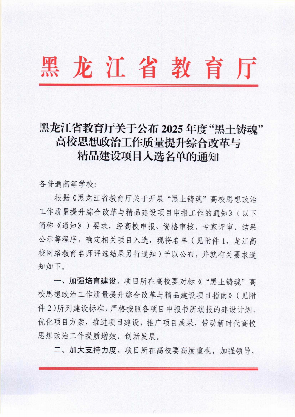 近日,黑龙江省教育厅公布2025年度“黑土铸魂”高校思想政治工作质量提升综合改革与精品建设项目入选名单,永利官网5个项目成功入选,入选项目数量居省内高校前列。