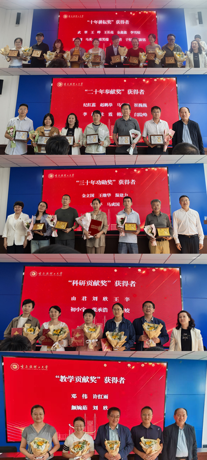 在表彰环节,学院以庄重温暖的仪式为不同领域、不同教龄段的优秀教职工颁发荣誉奖章。“十年耕耘奖”授予入职十周年的青年教师,他们怀揣教育热忱扎根讲台,以创新活力为课堂注入新动能;“二十年奉献奖”致敬深耕一线二十载的教师,他们凭借丰富经验与育人情怀,成为学科建设、人才培养的中坚力量;“三十年功勋奖”礼赞将三十年光阴奉献给三尺讲台的资深教师,他们亲历学院从成立到壮大的历程,用坚守与热爱诠释教育初心。现场特别致敬从教36年的刘晓晶老师:从初登讲台的普通教师,到成长为国家一流课程负责人、斩获多项教学成果奖,她以严谨治学的态度与示范引领的担当,诠释了教育者的坚守,赢得全场深深敬意。此外,大会还颁发“教学贡献奖”,表彰深耕教学一线、以深厚功底与生动课堂践行育人使命的教师,以及在科研领域取得突出成绩、为学院学术声誉与创新发展注入动力的“科研贡献奖”。