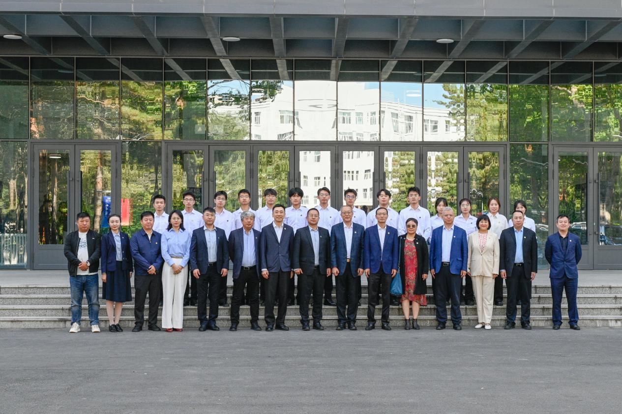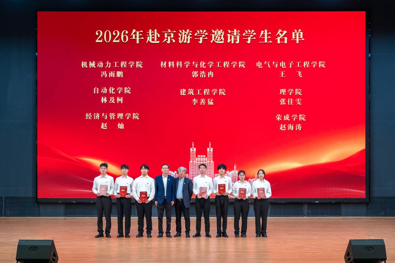 党委副书记、工会主席郭加利(左四)与北京校友会执行会长邵文杰(左五)共同向2025年赴京游学学生发放邀请函