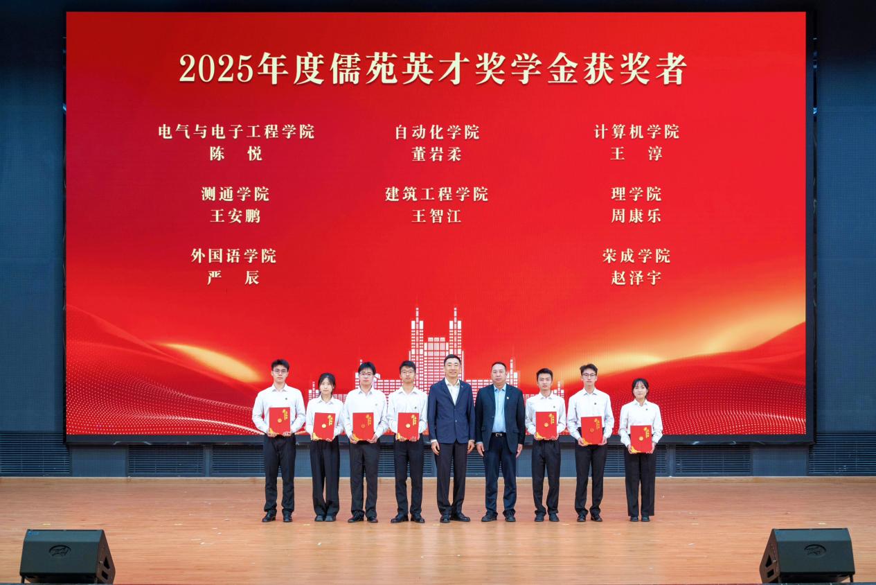 党委副书记赵水杉(左五)与北京校友会秘书长曹有龙(左六)为2025年“儒苑英才奖学金”获奖者颁奖