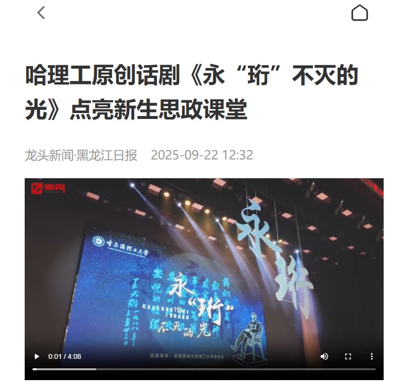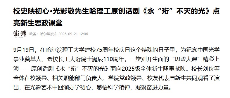 此次话剧展演获得广泛关注,光明日报、学习强国、中国新闻网、央广网、澎湃新闻、中国教育新闻网、中国教育在线、新浪、网易、搜狐、黑龙江日报、黑龙江网、龙头新闻·生活报、哈尔滨新闻网等多家媒体纷纷报道,聚焦其思政育人价值与艺术感染力。作为学校“大思政”格局下的实践创新,话剧背后还有“追光之旅”系列活动支撑——校领导带队,组织师生赴中国光学科技馆、王大珩故居等地实地调研,让精神传承更有深度。