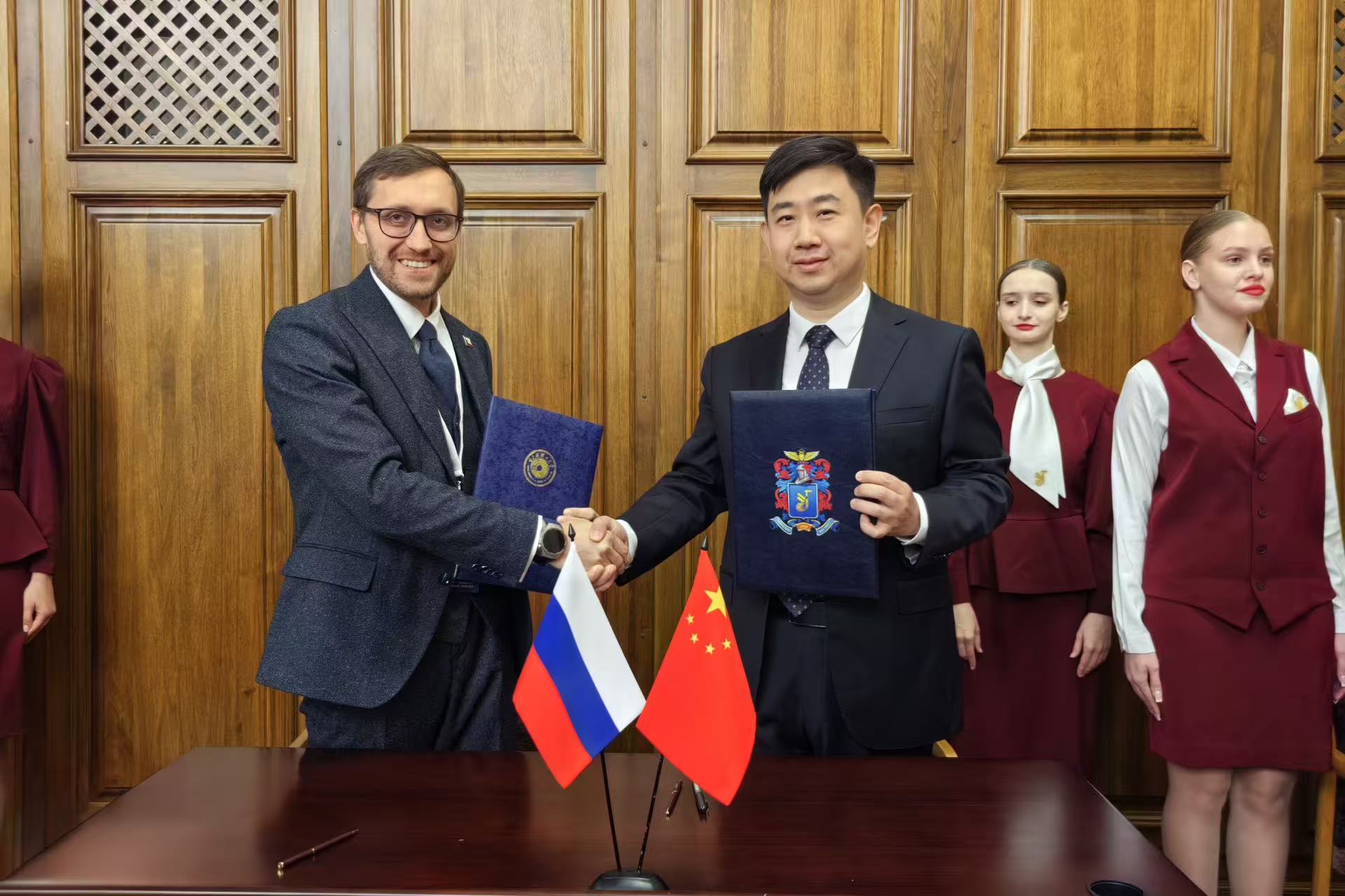 出访期间,代表团积极拓展合作网络,先后与俄罗斯国家研究型大学-伊尔库茨克国立理工大学、阿穆尔国立大学、萨哈林国立大学等高校校长进行深入交流并签署相关合作协议。双方围绕研究生联合培养、学术交流互鉴、合作领域拓展等议题展开交流、凝聚共识,为中俄高校务实合作注入新动能。各方一致认为,在当前中俄全面战略协作伙伴关系不断深化的背景下,高校作为人才培养的主阵地和科技创新的策源地,必须以高层次人才联合培养为纽带,打破国界与学科壁垒,构建长期稳定、优势互补的合作机制。这不仅是提升两国高校核心竞争力的必然选择,更是为中俄各领域合作储备高素质专业人才、夯实两国友好合作社会基础的重要途径。
