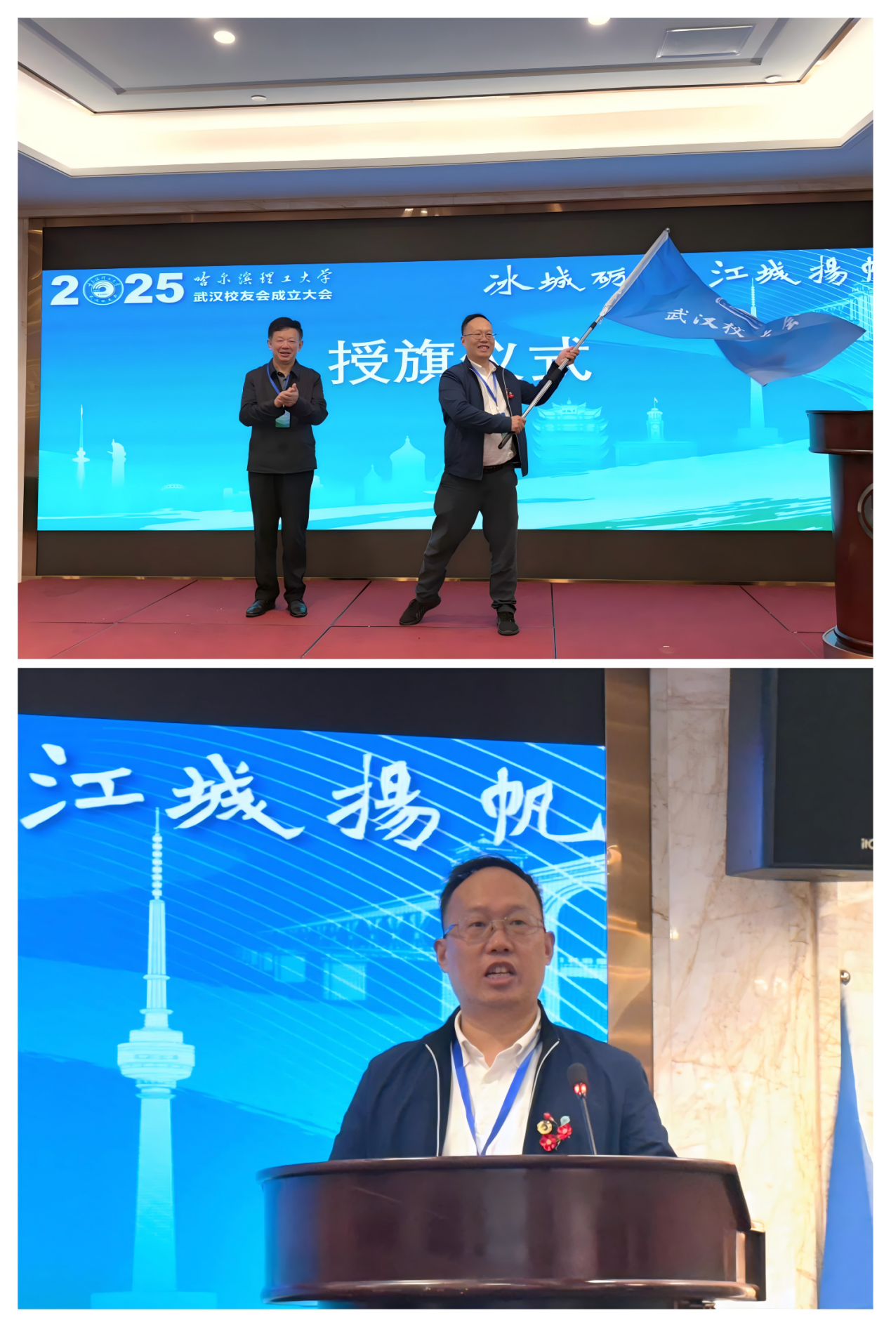 在全场校友的见证下,郭二军代表校友总会宣读了成立武汉校友会的批复,并向首任会长陈琳授予武汉校友会会旗,标志着武汉校友会正式扬帆起航。
