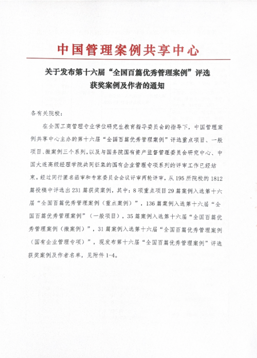 作为全国工商管理案例领域的最高荣誉,“全国百篇优秀管理案例”的评选标准兼具学术严谨性与实践指导性,其先后纳入教育部2012年第三轮学科评估指标体系(C5指标)和2016年工商管理硕士专业学位水平评估指标体系(C1指标)。第十六届全国百优案例评选共收到来自全国195所院校的1812篇投稿,经过同行匿名函审和专家委员会会议评审两轮评审,评选出231篇获奖案例,其中136篇案例入选第十六届“全国百篇优秀管理案例(一般项目)”。