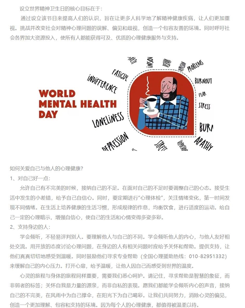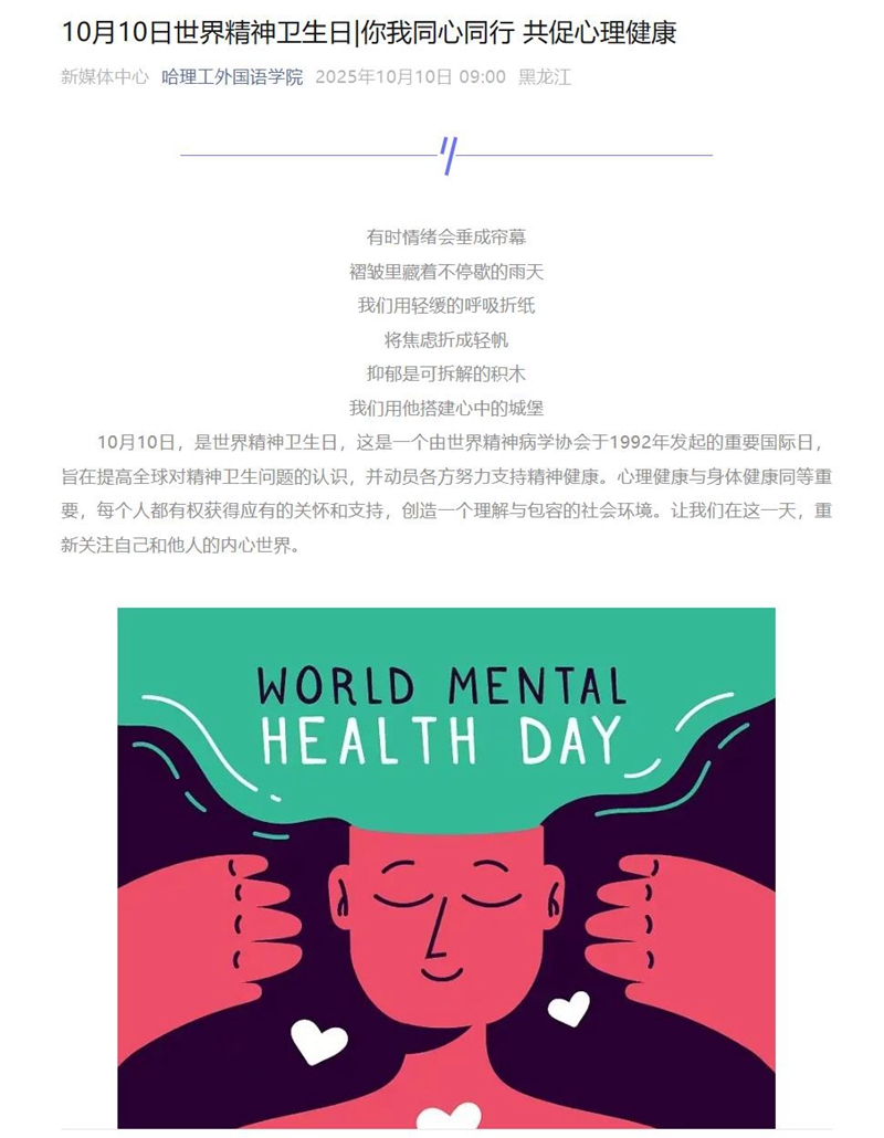 外国语学院于10月10日发布“你我同心同行 共促心理健康”小贴士,引导学生关心自己和关爱他人。