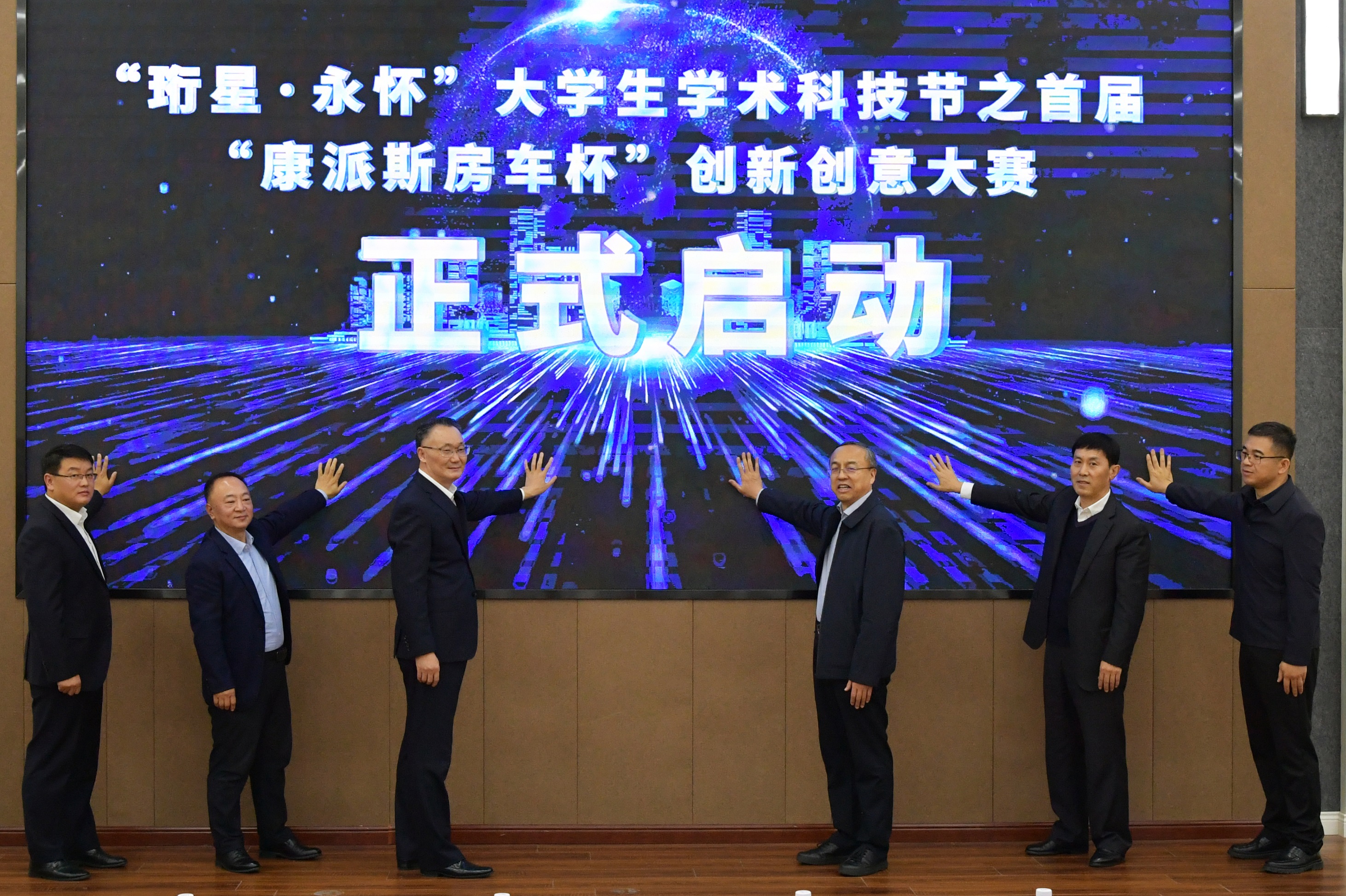 臧永军、王刚、王位元、段宏伟、闫明明、刘绍勋共同触摸启动屏,正式启动“珩星·永怀”大学生学术科技节之首届“康派斯房车杯”创新创意大赛。