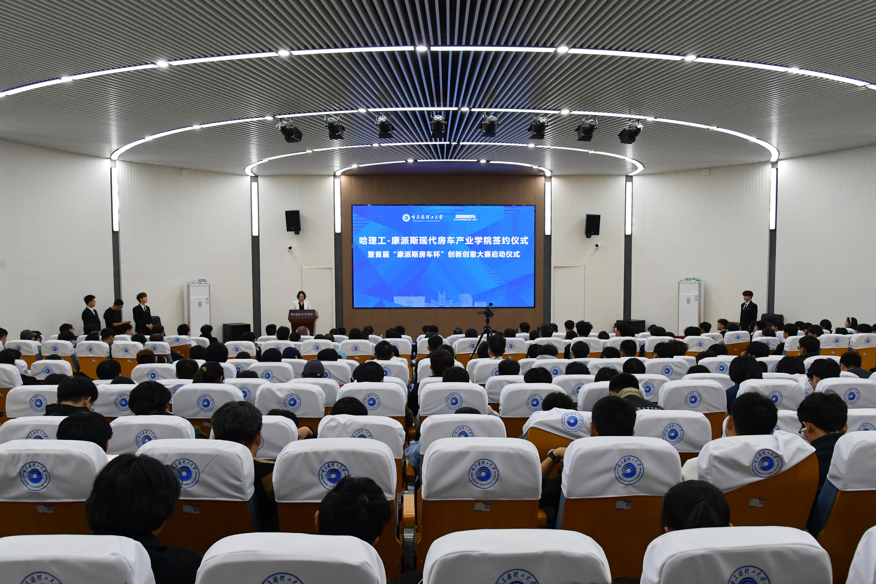 11月10日下午,荣成学院与荣成康派斯新能源车辆股份有限公司在荣成学院大学生活动中心举行“哈理工-康派斯现代房车产业学院”签约启动仪式,同步启动“珩星·永怀”大学生学术科技节之“康派斯房车杯”创新创意大赛。这一举措标志着校地企合作迈入新阶段,成为深化产教融合、服务区域经济发展的生动实践。