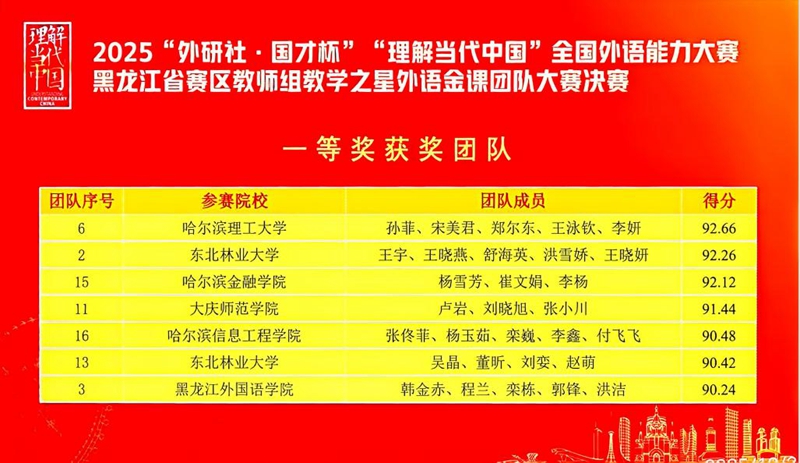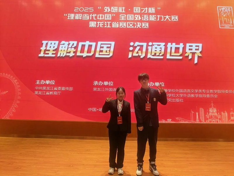 近日,2025“外研社·国才杯”“理解当代中国”全国外语能力大赛黑龙江省赛区获奖名单公布,永利官网师生在各项赛事中表现亮眼,学生组共荣获金奖7项、银奖6项、铜奖9项,其中金奖选手将代表黑龙江省赛区出征本年度全国总决赛;在教师组比赛中,外国语学院大学外语教学部孙菲、宋美君团队凭借《大学英语》课程的精彩展示,夺得黑龙江省赛区决赛一等奖,英语系魏智男、田凌云团队获得省赛三等奖。