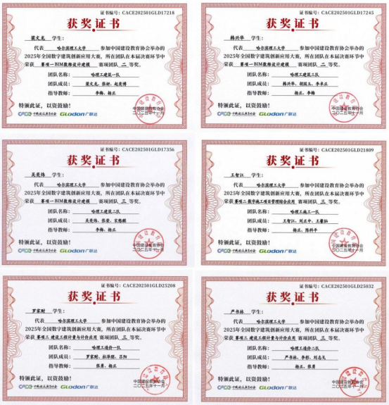 决赛中,哈理工学子充分发挥团队协作精神,将课堂所学与工程实践深度结合,在数字建模、施工管理、计量计价等核心环节展现出过硬的专业素养。在赛项1中,建筑团队运用BIM技术完成公建与住宅建模任务,精准呈现建筑结构细节与空间逻辑,凭借高效的建模质量与创新的设计思路,斩获国家级二等奖2项、国家级三等奖1项;在赛项2中,施工队整合BIM建模、施工现场规划、进度管理等多模块技能,模拟真实工程场景下的施工全流程管控,荣获国家级三等奖1项;赛项3的造价队直面挑战,熟练运用数字化计量工具与计价方法,精准完成建筑装饰、电气给排水等专业计量及招标控制价编制任务,获得国家级三等奖2项,实现学院在该赛项的零的突破。