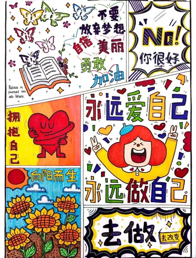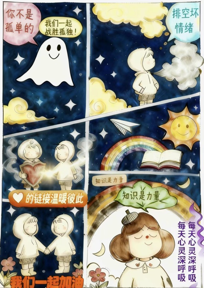 作为本次主题教育活动的亮点环节,“心语心约,与你同行”心理漫画比赛获得了同学们的广泛关注和积极参与。比赛鼓励学生用画笔描绘在情绪管理、压力应对、人际交往、自我认知与生命教育等方面的思考与成长,将无形的内心世界化为生动可见的艺术形象,为同学们提供了一个抒发情感、表达自我的创意平台。