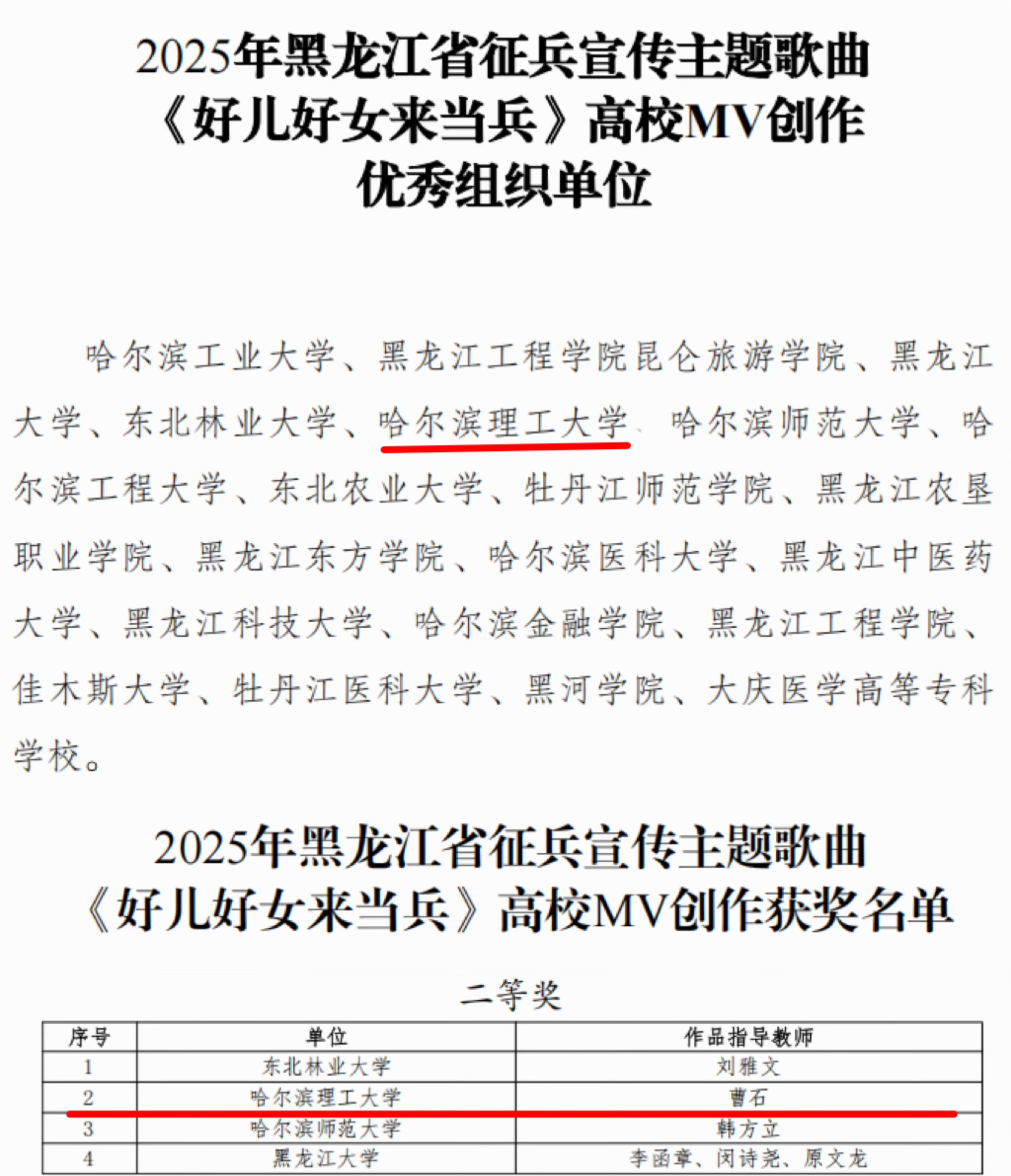 近日,黑龙江省教育厅、黑龙江省人民政府征兵办公室下发了《关于公布2025年黑龙江省征兵宣传主题歌曲<好儿好女来当兵>高校MV创作评选结果的通知》,永利官网荣获2025年黑龙江省征兵宣传主题歌曲《好儿好女来当兵》高校MV创作优秀组织单位和优秀指导教师奖项。