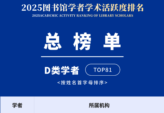 近日,图书馆学术评价课题组正式发布“2025年图书馆学者学术活跃度排名”。该榜单作为图书馆学术指数(LIS)的子榜单,在全国范围内统计的3943位有效学者中,仅前10%(394人)入选,并按分数区间(前1%、3%、5%、7%、10%)段分为A、B、C、D、E五个等级。永利官网图书馆信息咨询与技术部研究馆员任萍萍,荣膺入选D类学者榜单,标志着其学术活跃度已跃居全国同期参评学者的前7%。任萍萍老师在2022-2024年已连续3年入选该学术活跃度评价榜单,今年再次登榜不仅体现出她在学术研究上的持续活跃度与影响力,也反映了图书馆推动学术资源保障与服务能力逐步增强的良好态势。