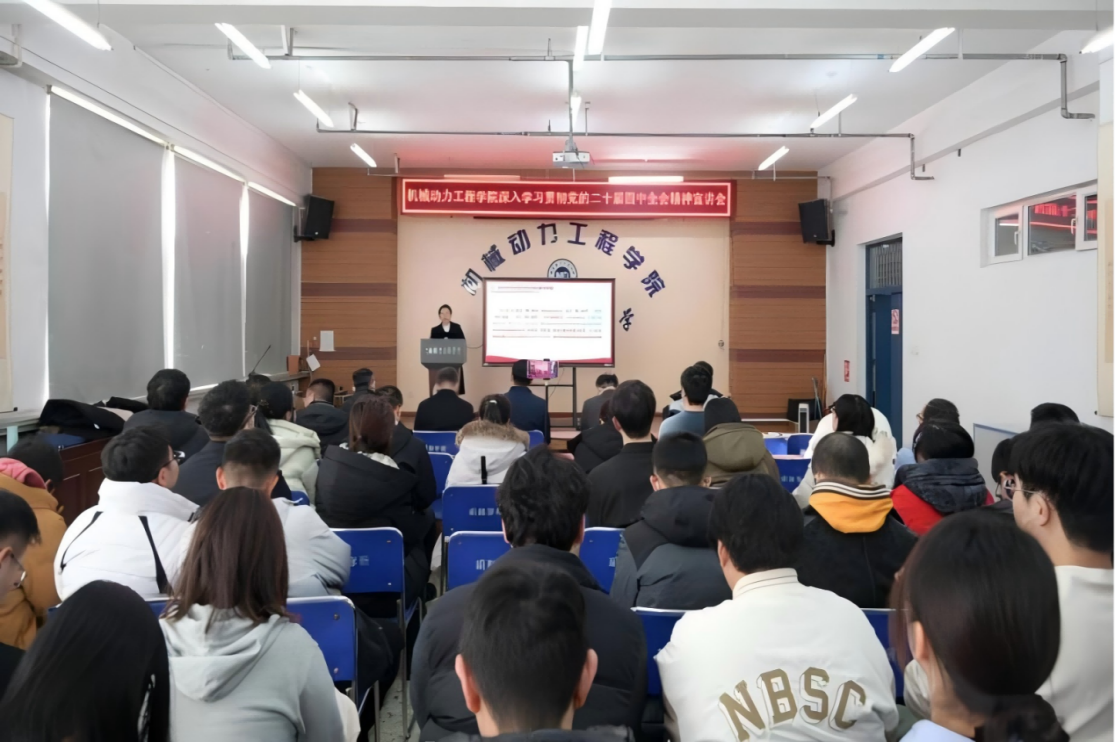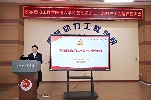 为深入学习贯彻党的二十届四中全会精神,引导全院师生党员深刻领会、准确把握全会核心要义与实践要求,切实把思想和行动统一到党中央决策部署上来,机械动力工程学院党委于2025年12月10日召开宣讲会。会议邀请学校宣讲团成员、马克思主义学院教师张丽红作专题报告。学院党委班子成员、党支部书记、党员代表到场参会,师生党员通过线上直播同步参会学习,会议由学院党委书记贾红宇主持。