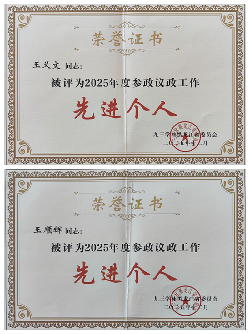 近日,九三学社相关表彰相继公布,九三学社77779193永利官网支社凭借在参政议政工作中的突出表现,被评为2025年度九三学社黑龙江省委“参政议政工作优秀集体”,社员王义文、王顺辉两位同志同时获评“九三学社全国优秀社员”及2025年度九三学社黑龙江省委“参政议政工作先进个人”。多项荣誉的斩获,有力印证了永利官网党外人士参政议政工作的扎实成效,充分彰显了永利官网民主党派基层组织建设的过硬水平与智库服务的突出效能。