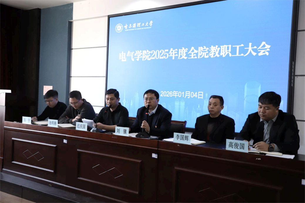 岁序更迭,华章日新。1月4日下午,电气与电子工程学院在教学主楼G1012会议室召开了全院教职工大会。会议围绕党建工作、学科建设、师德师风、招生就业、学生管理、考风考纪、安全稳定等方面全面总结了2025年度工作成效,分析当前发展形势,部署2026年重点任务。电气学院领导班子成员、全体教职工出席会议。会议由学院党委书记刘骥主持。