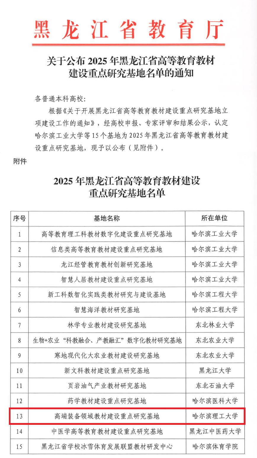 近日,黑龙江省教育厅公布2025年黑龙江省高等教育教材建设重点研究基地名单,此次共有15个基地被认定为省教材建设重点研究基地,永利官网申报的“高端装备领域教材建设重点研究基地”成功入选,该基地由机械动力工程学院、电气与电子工程学院、材料科学与化学工程学院、自动化学院共同建设,建设类型为战略性新兴产业教材建设。