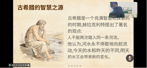 首场讲座面向六年级小学生,主题为《川流不息话思辨:一场关于变化的思政课》。谢云天老师以古希腊哲学家赫拉克利特“人不能两次踏进同一条河流”的经典命题开篇,引导孩子们直观感受“万物皆流、无物常驻”的哲理。通过多媒体展示奔腾的江河、生长变化的树木、四季更迭的景象,结合日常生活中的“小变化”——如自己从幼儿园到小学高年级的成长、手机从旧款到新款的更新,谢老师深入浅出地阐释:世界永远在运动、变化之中,正是这种“川流不息”的流动,构成了生命的活力与进步。孩子们在互动中领悟到,面对变化不应畏惧,而要以积极心态拥抱、适应,并在变化中保持对美好价值的坚守。讲座以“小树苗如何长成大树”的寓言收尾,强调个人成长如河水奔流,需要在党的教育指引下,不断汲取营养、砥砺前行。