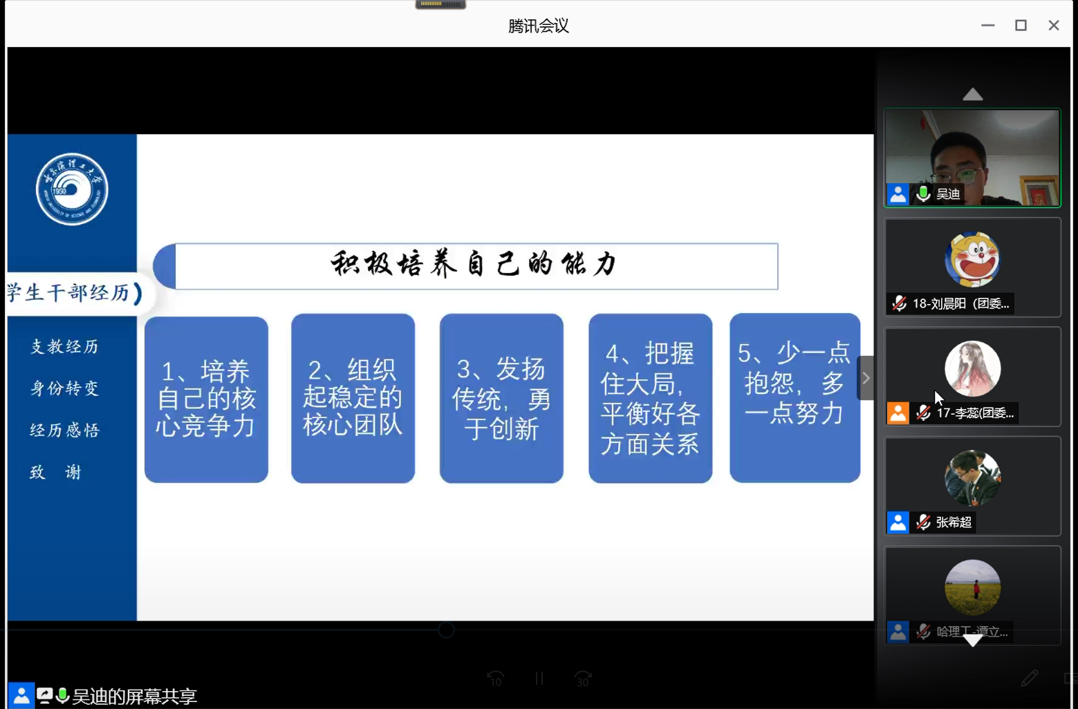 此系列经验分享会使同学们收获良多,对学习、工作、生活中的成长有了很大的促进,引导着青年团员们树立正确的积极的思想观念,更加积极进取,不懈追求。青少年是中国新时代的圆梦者,“有理想、有本领、有担当,国家就有前途,民族就有希望”,这是新时代对青年寄予的厚望。不付国家众望,努力学习科学文化知识,提高自己的能力,不忘初心牢记使命,争做新时代青年,为中华民族的伟大复兴奋斗终生。