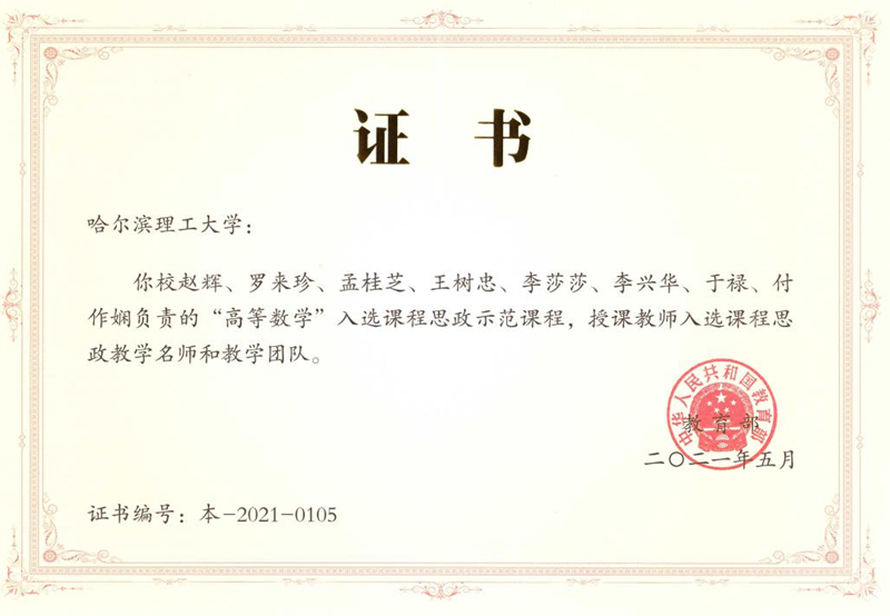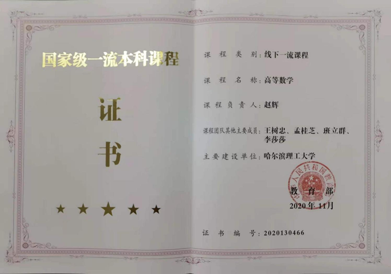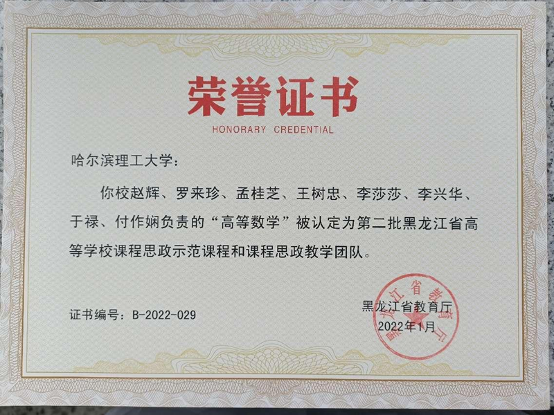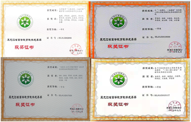 “高等数学”荣获首批国家级课程思政示范课程、教学名师、教学团队,“高等数学”荣获首批国家级一流本科课程,高等数学、概率论与数理统计、复变函数与积分变换分别荣获省级一流本科课程,“概率论与数理统计”荣获省级精品在线开放课程,“高等数学”荣获黑龙江省课程思政示范课程、教学团队,“线性代数”获评黑龙江省课程思政示范课程和教学团队培育项目。在2021年7月,教学团队在“黑龙江省高等学校课程思政建设工作推进会议”中受到表彰,赵辉教授在黑龙江省高等学校课程思政建设成果展上分享了课程思政建设的经验与体会,全省80所高校、近万人线上、线下参会。