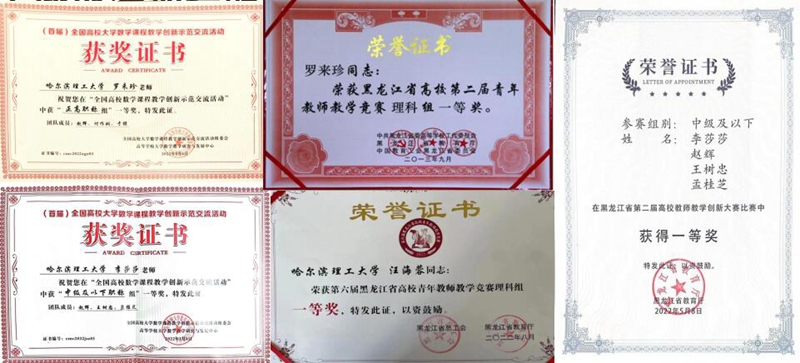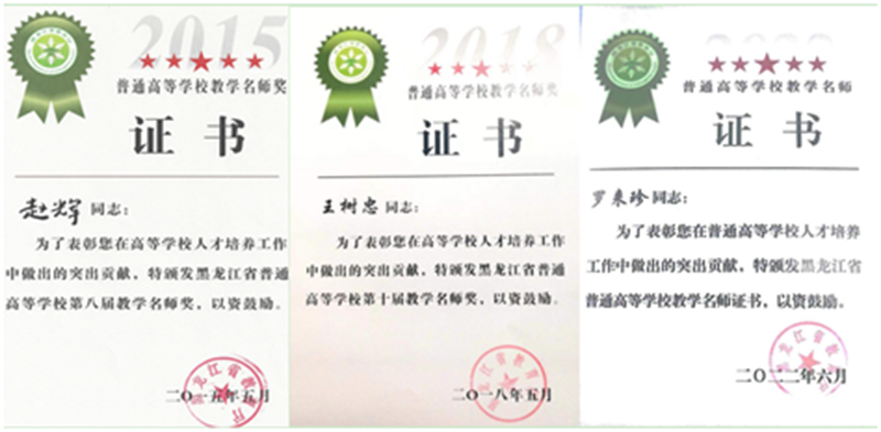 团队参加了全部六届黑龙江省高校青年教师教学竞赛,共获得一等奖4项、二等奖1项、三等奖1项。汪海蓉老师在第六届黑龙江省高校青年教师教学竞赛中喜获一等奖。