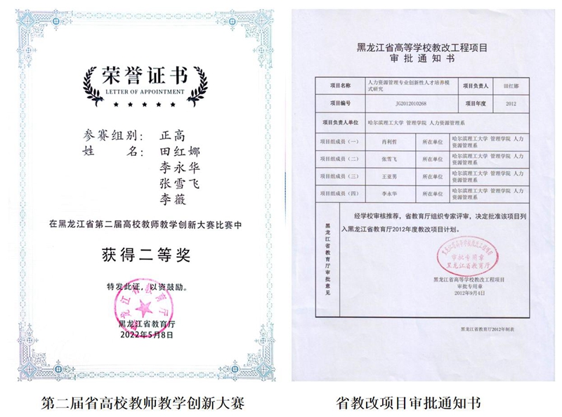 她潜心教学研究,作为负责人主讲的课程获批成为第二批国家一流本科课程、省级一流课程;获省第二届教师教学创新大赛二等奖、校教师教学创新大赛一等奖;主持省教改项目2项、省高等学校课程思政示范课程和教学团队培育项目、2023年度黑龙江省研究生课程思政建设项目、校级研究生精品示范课程建设项目和学院一流课程改革与建设项目;以第一作者发表7篇教改论文、以第二作者出版1本教材;作为核心成员获省高等教育教学成果二等奖1项;获校年度工作人员奖励嘉奖;获校教学名师、获校“优秀主讲教师”、校“职业生涯规划大赛优秀指导教师”等荣誉称号。