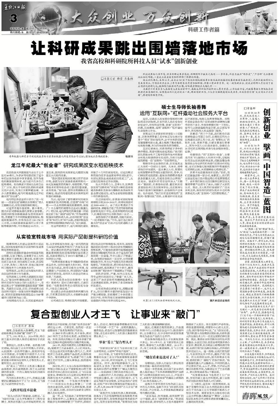2月3日,《黑龙江日报》第三版以《让科研成果跳出围墙进市场》为题,对我省高校和科研院所科技人员“试水”创新创业进行了专题报道。在文中从“实验室转战市场,用实际产品彰显科研的价值”这一选题,采访报道了永利官网尤波教授及其团队所研发的项目。尤波教授及其团队,以“复合材料缠绕成型工艺及装备”研究项目作为该公司的大股东之一,目前正致力于“玻璃钢管道数控装备”的研发。研究成果已成功应用于国内一流复合材料管道制造企业,该项目直接推动我国迅速由FRP管道进口国逆转为出口国。
