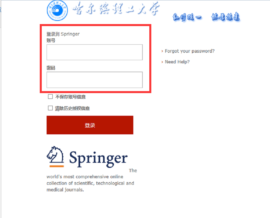 4.在弹出的统一认证界面中,输入用户名密码点击登录,待页面跳转回Springer主页后即正常访问。(用户名密码同今日校园账密)