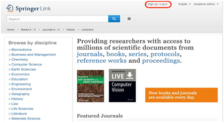 1.用谷歌或者IE浏览器打开Springer主页https://link.springer.com,点击网页右上方的“Sign up/Log in”链接。