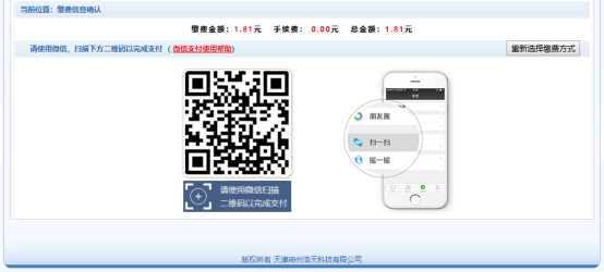在缴费方式中选择微信缴费图标,确认缴费金额后,如下图所示,打开手机微信APP,通过扫一扫功能扫描图中二维码信息完成支付。