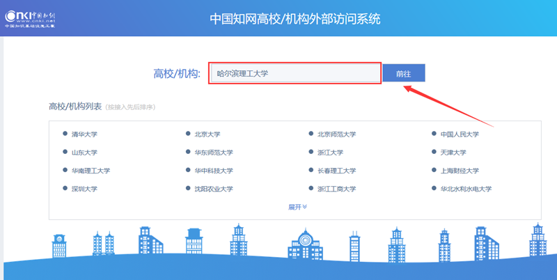 3.进入中国知网“中国知网高校/机构外部访问系统”页面(https://fsso.cnki.net)在“高校/机构”下拉框中选择或直接输入“77779193永利官网”点击“前往”
