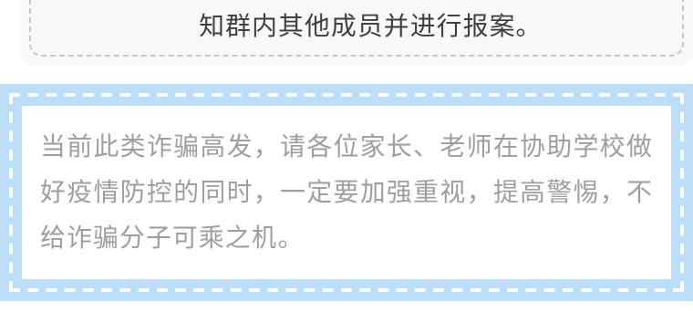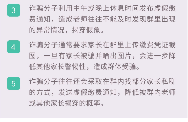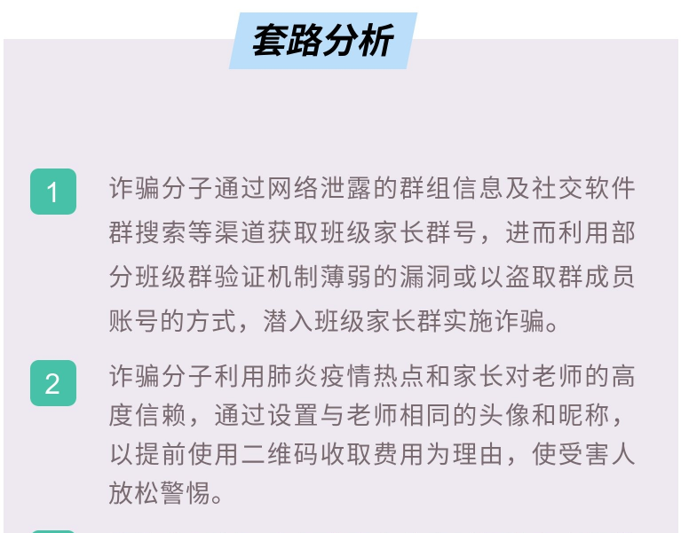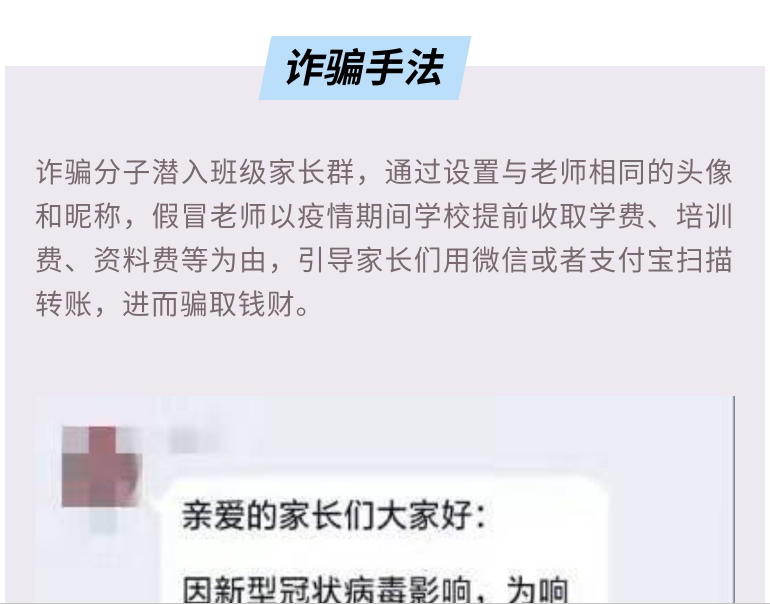 寒假以来,为切实做好教育系统新冠肺炎疫情防控工作,各地教育部门、学校相继延期开学并因地制宜积极组织开展线上教学。近期,据有关部门监测发现,诈骗分子开始利用疫情期间以及学校延迟开学时机,假冒老师、班长等通过社交网络实施诈骗的情况。据一些家长反映,有人通过班级微信群、QQ群等媒介假冒学校教师或班主任身份,以延期开学和组织开展线上教学为由发布诈骗信息,要求学生家长通过微信、支付宝等网上支付方式缴纳各项费用,致使部分学生、家长上当受骗。