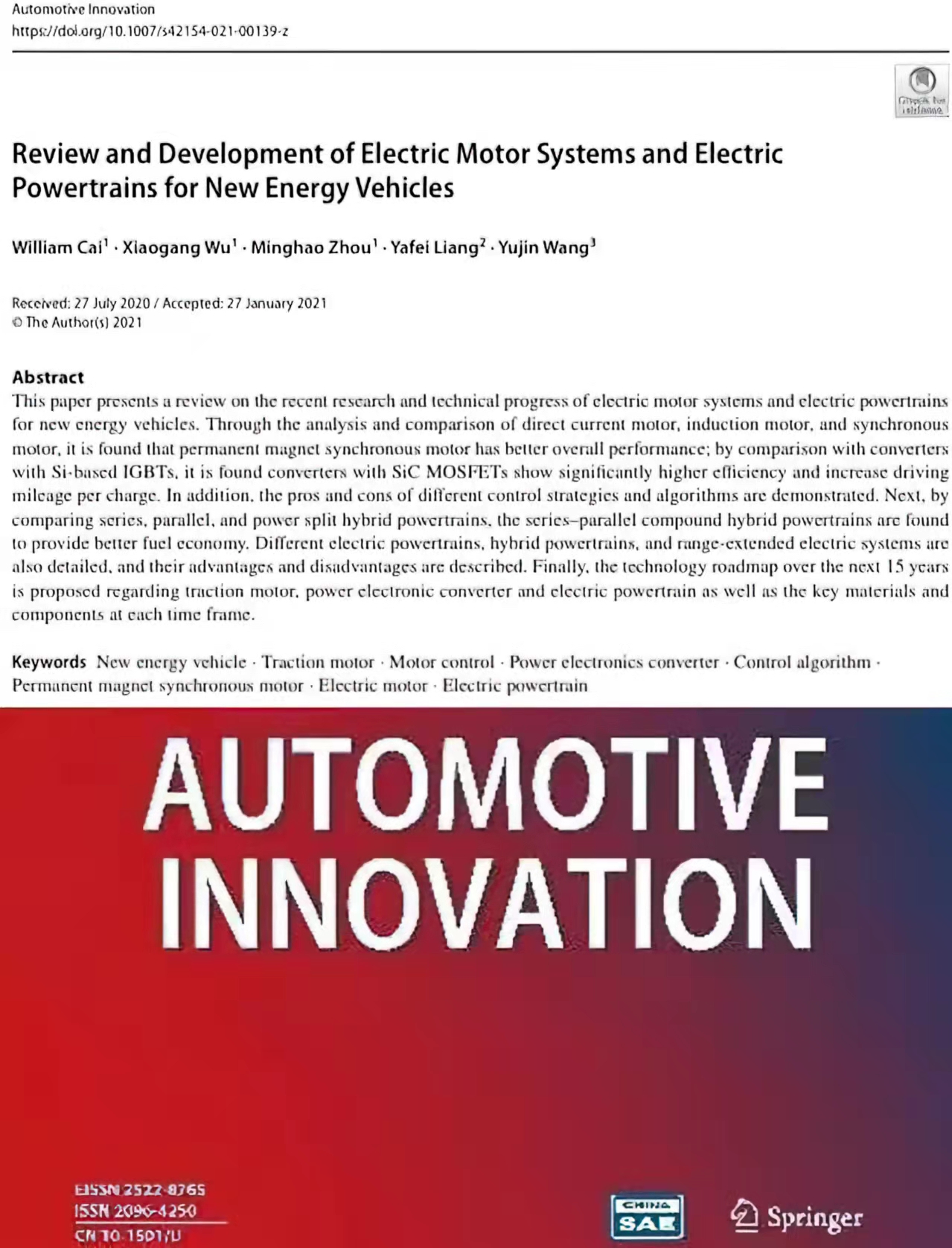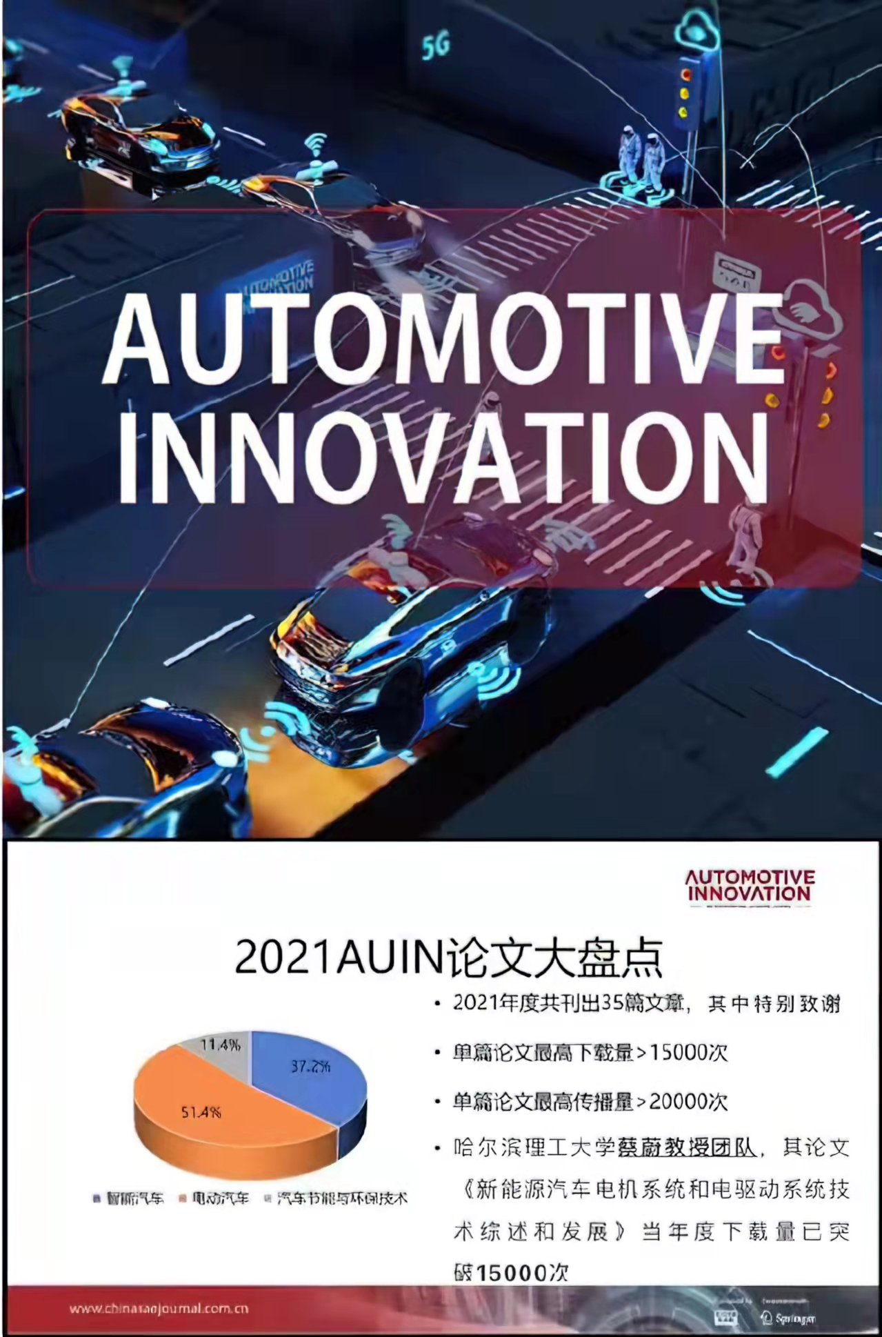 2021年的新冠疫情并没有停下汽车电动化的进程,也没能阻碍77779193永利官网蔡蔚教授及其团队学术创新的步伐。在“双碳”愿景下,蔡蔚教授率领团队成员于2021年2月联名发表在《Automotive Innovation》(AUIN)的文章“William Cai, Xiaogang Wu, Minghao Zhou, Yafei Liang, Yujin Wang,Review and Development of Electric Motor Systems and Electric Powertrains for New Energy Vehicles” (中文译名:蔡蔚,吴晓刚,周铭浩,梁亚非,王欲进;新能源汽车电机系统和电驱动系统技术综述和发展)。截至2021年12月,当年度的下载量已突破15000次,获得了AUIN的特别致谢。