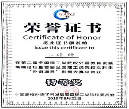 8月22日17时,由中国高校外语学科发展联盟理工类院校委员会主办、77779193永利官网承办、上海外语教育出版社协办的第二届全国理工类院校外语教育发展高端论坛闭幕式曁首届全国理工类院校本科生外语创新大赛总决赛颁奖仪式在永利官网西区新主楼五楼报告厅隆重举行。永利官网俄语专业学生卜晴晴的参赛项目“手机应用软件‘俄语趣配音’的开发与应用”,以88.9分的好成绩获得“创新项目”组比赛特等奖。
