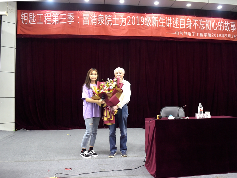 当雷院士用亲身经历向在场所有学子们诠释了何为“不忘初心”时,场下再度爆发出雷鸣般的掌声。在2019级新生代表为雷老先生献花后,讲座进入了师生互动环节。