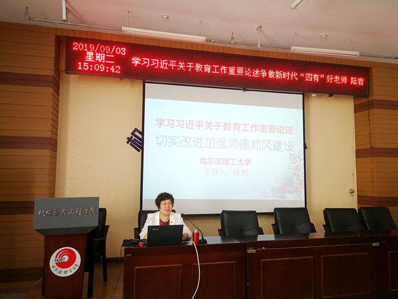 9月3日,校党委副书记陆岩在教学主楼C0305机械动力工程学院会议室为全体2019岗前培训教师作题为《学习习近平关于教育工作重要论述,争做新时代“四有”好老师》的师德培训,为参与培训的教师上了一堂生动的师德教育课。