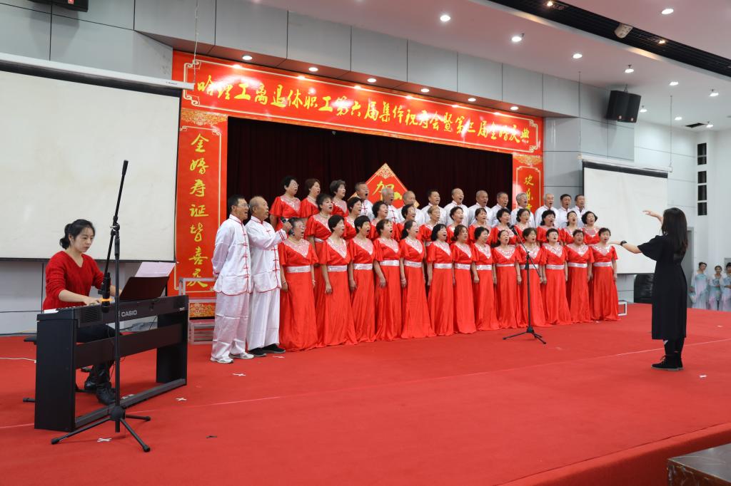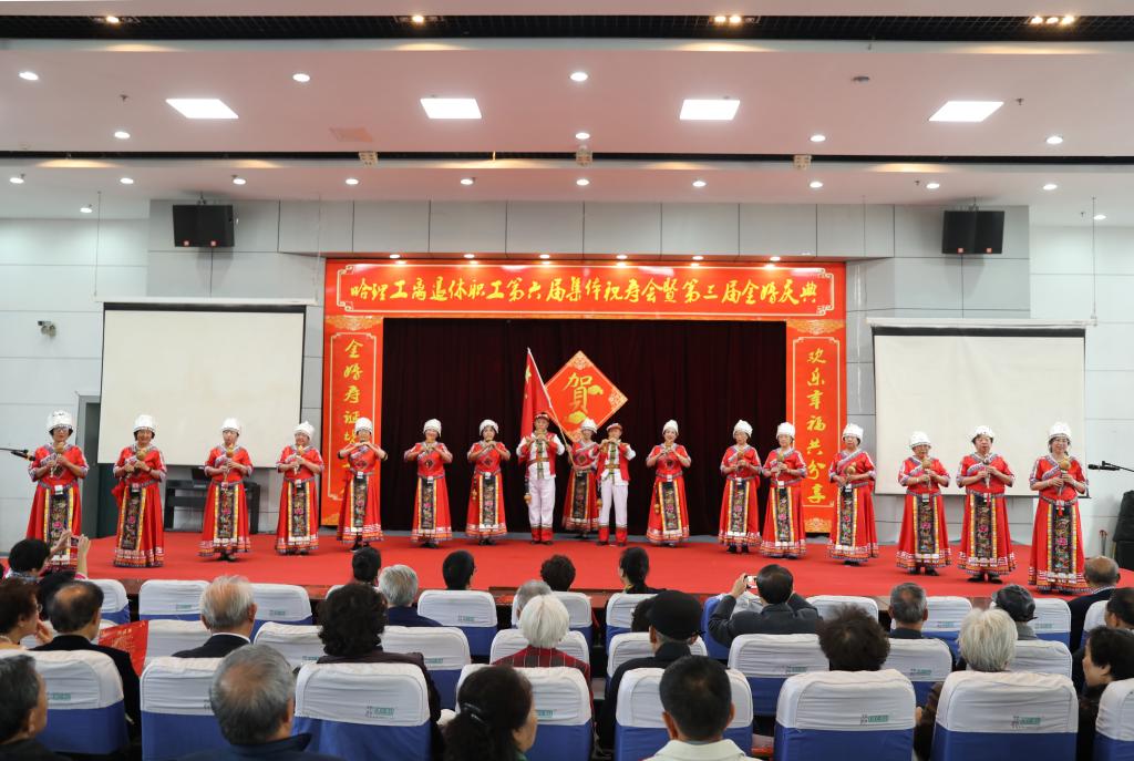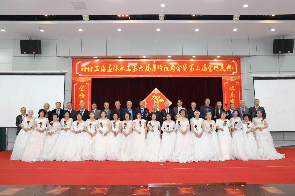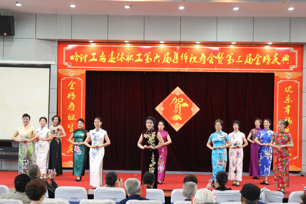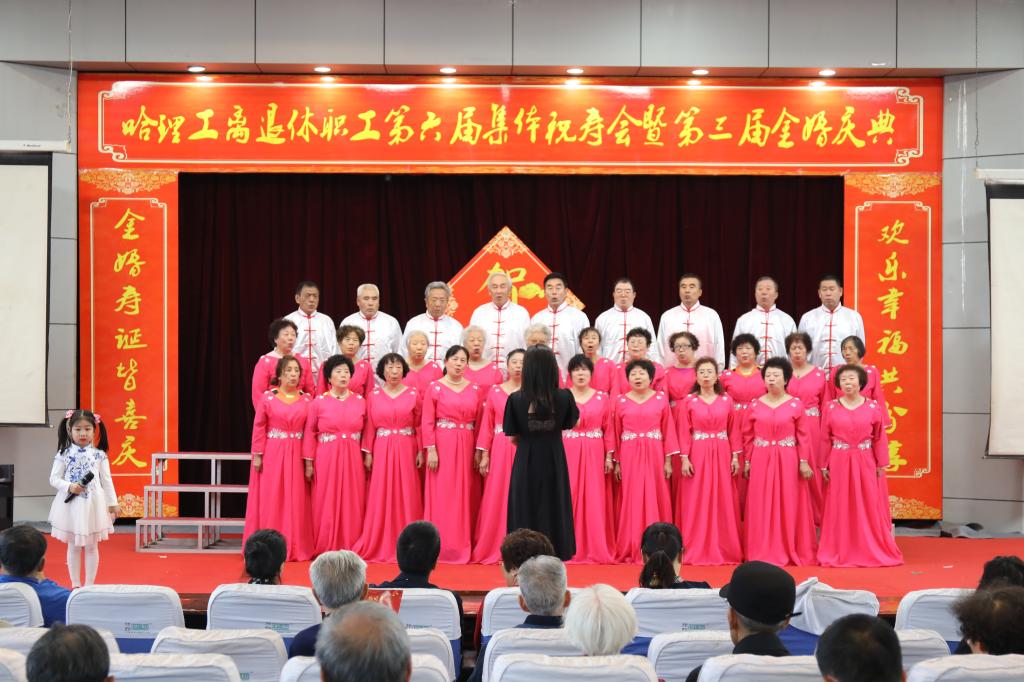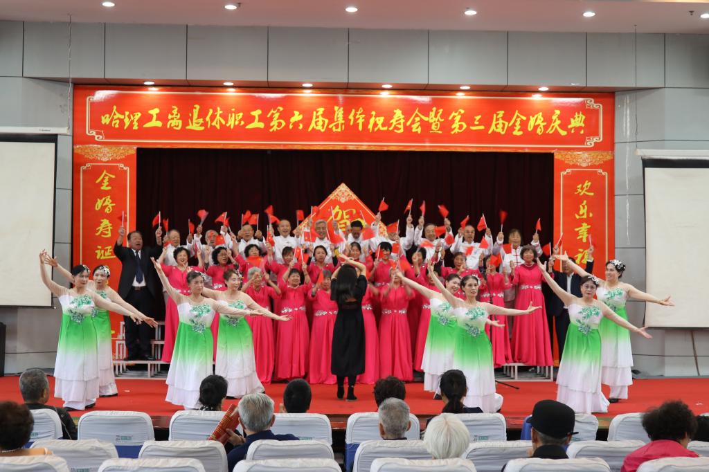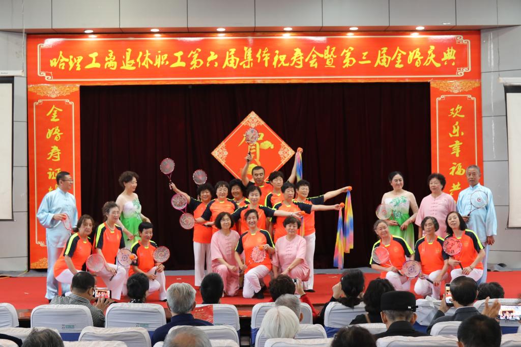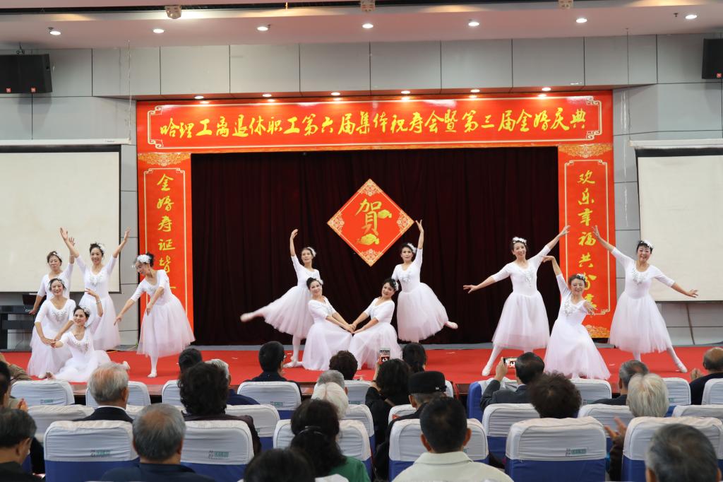 庆典仪式后,哈理工老年学院学员们为金婚夫妇、寿星们献上了一台精彩的文艺演出,祝福老同志们身心健康,阖家幸福。合唱《我爱你中国》、《登鹳雀楼》、《我和我的祖国》、舞蹈《采薇》、葫芦丝表演《映山红》、芭蕾形体《春天的芭蕾》、柔力球表演《柔力情思》、模特表演《水乡新娘》将现场气氛一次又一次带向高潮,让理工老寿星们、金婚夫妇、共和国同龄人享受了一次丰富的精神盛宴。
