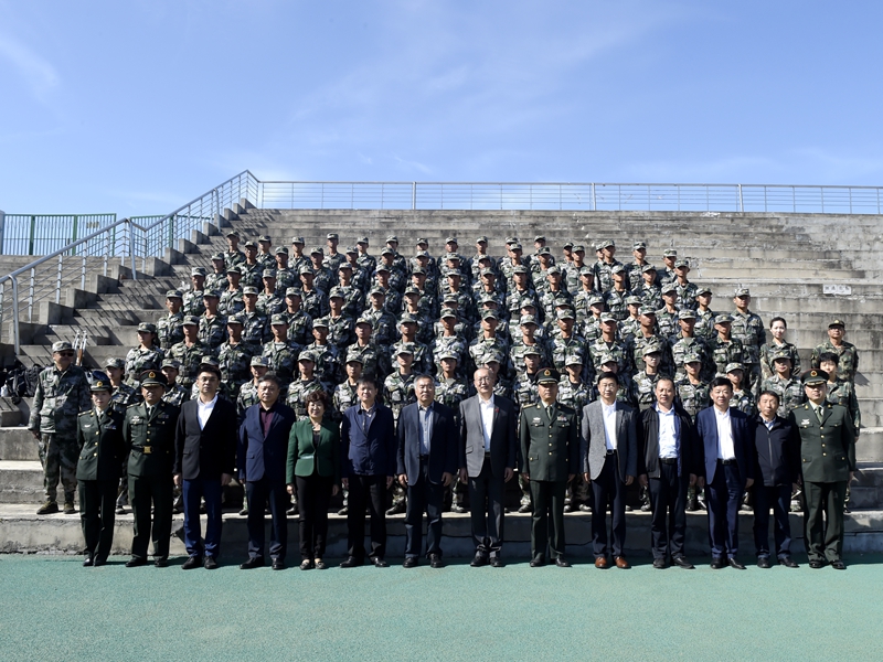 汇报会结束后,校领导和与会嘉宾与承训教官合影留念。(摄影:徐状 大学生记者团)