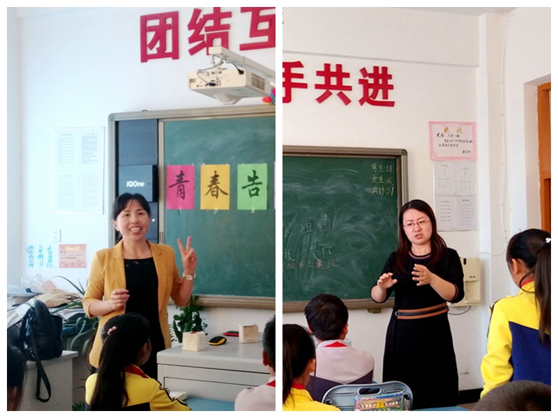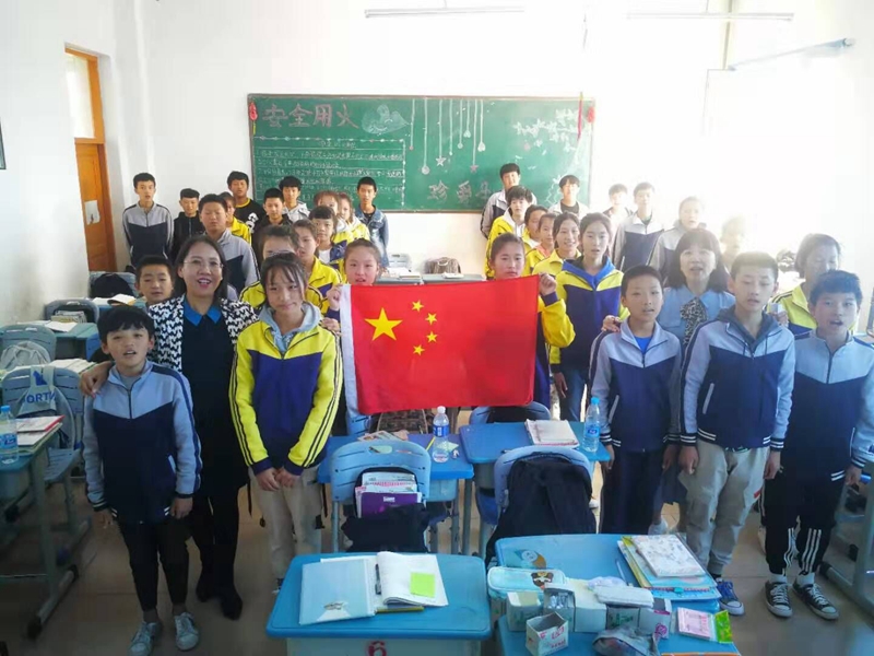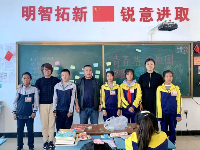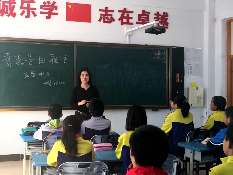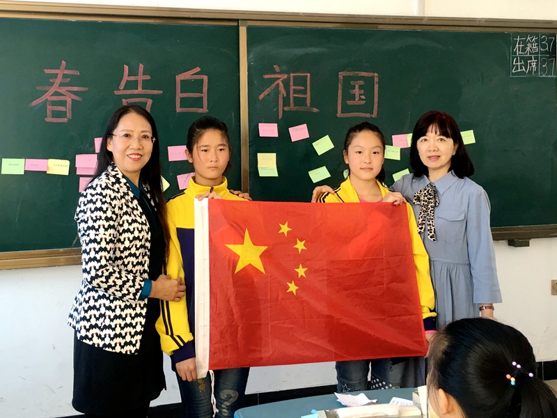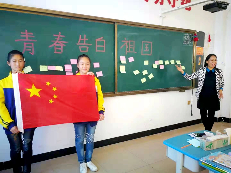 捐赠仪式结束后,参加活动的8位女博士深入康庄学校四个班级开展“青春告白祖国”主题班会活动。活动中,女博士老师们与同学们共同回顾新中国成立70年的辉煌历程,制作“青春告白祖国”主题板报,朗诵爱国主题诗歌《沁园春.国庆》,同唱《我和我的祖国》《我爱北京天安门》等歌曲,开展以爱国为主题的有奖竞猜等活动。主题班会各有特色,同学们兴致高涨,气氛热烈,爱国氛围浓厚。每一位同学都通过小粘贴留言表达了自己对祖国的祝福。最后,主题班会活动以师生同向祖国告白、我爱你中国、祝福新中国70岁生日快乐结束。(摄影:徐状、女博士联谊会)