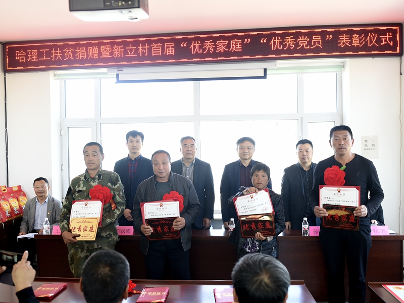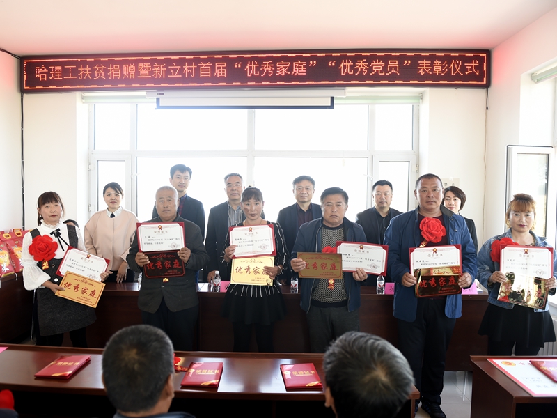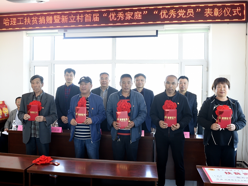 9月25日上午,哈理工产业扶贫电商项目捐赠仪式及新立村2019年度“优秀家庭”、“优秀党员”表彰系列活动在巴彦县丰乐乡新立村举行。校党委书记张洪涛、党委副书记王志浩,巴彦县党委组织部副部长许汉波,丰乐乡党委副书记贾彦莉、副乡长古力,永利官网统战部部长孙明哲、组织部副部长王莉娟、扶贫工作队队长兼驻村第一书记董少伟及扶贫工作队成员刘猛和张宏磊出席活动,新立村2019年度“优秀家庭”和“优秀党员”代表参加活动。活动由董少伟主持。