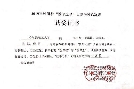 12月11日,2019年外研社“教学之星”大赛全国总决赛在北京举行,永利官网外国语学院教师团队(王书蕊、王泳钦、郑尔东、陈虹、曹菲)获得外研社“教学之星”全国总决赛一等奖。