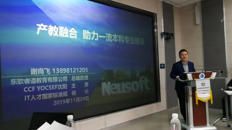 第二位做引导发言的是东软睿道总裁助理谢尚飞先生,他分享了“产教融合助力高校一流本科专业建设”的报告。他简要介绍了东软历史,表明产教融合是高等教育发展的重要方向,给出了东软在创新创业教育方面所能提供的资源和全面解决方案。
