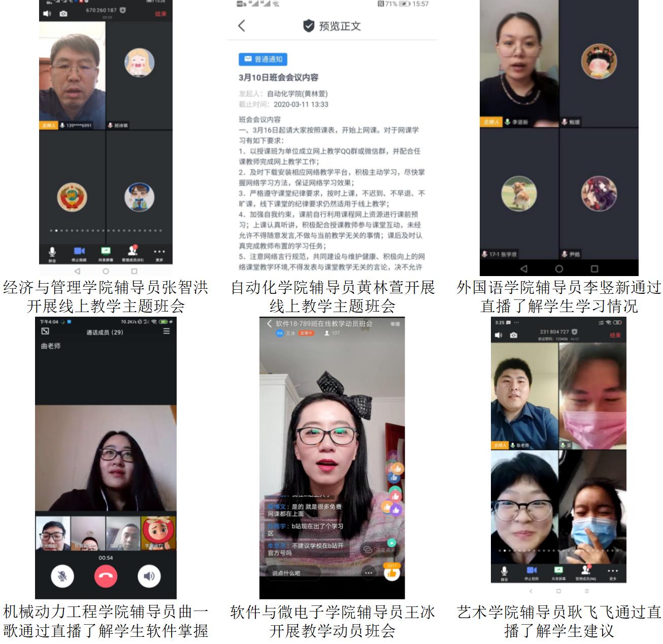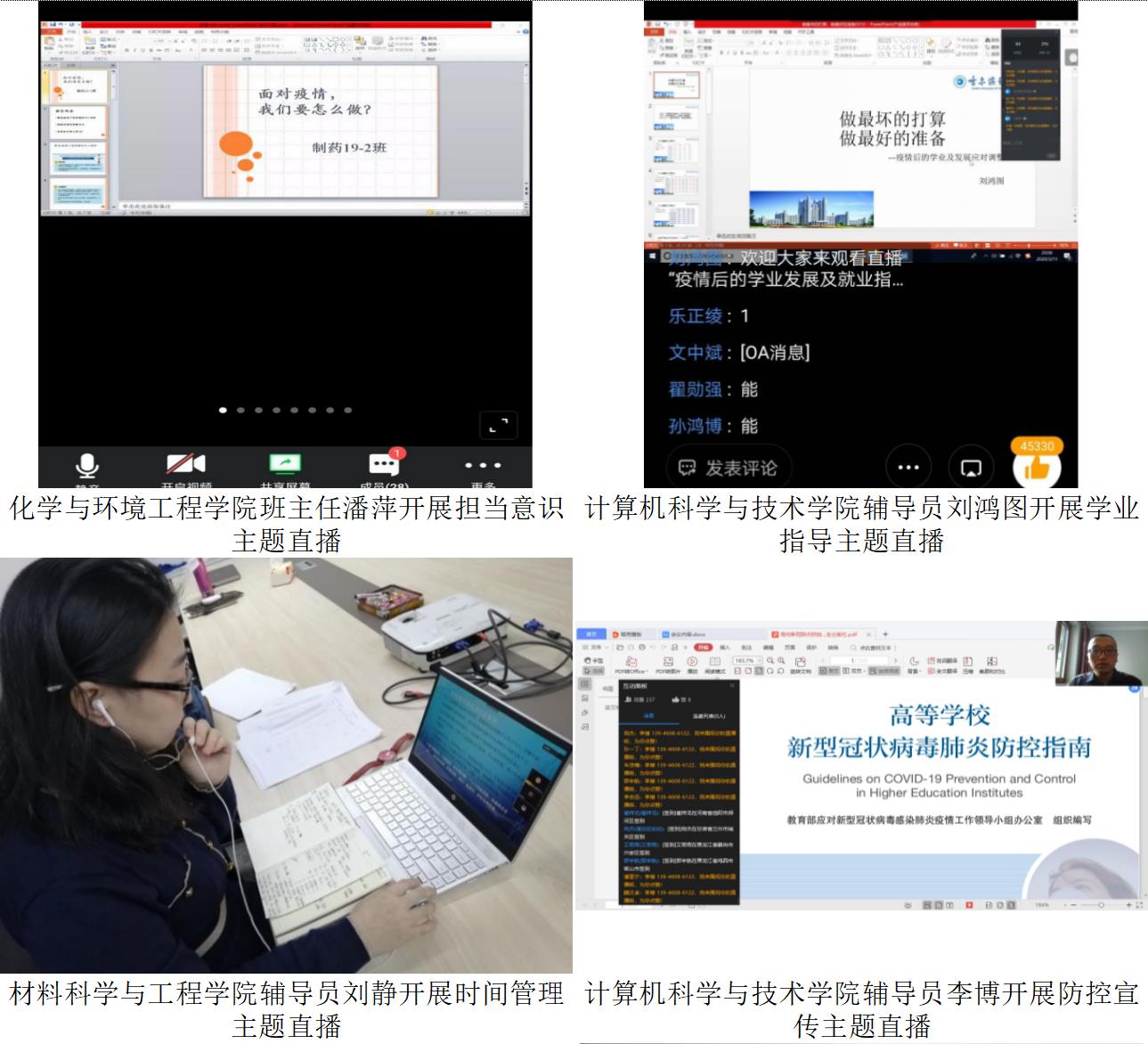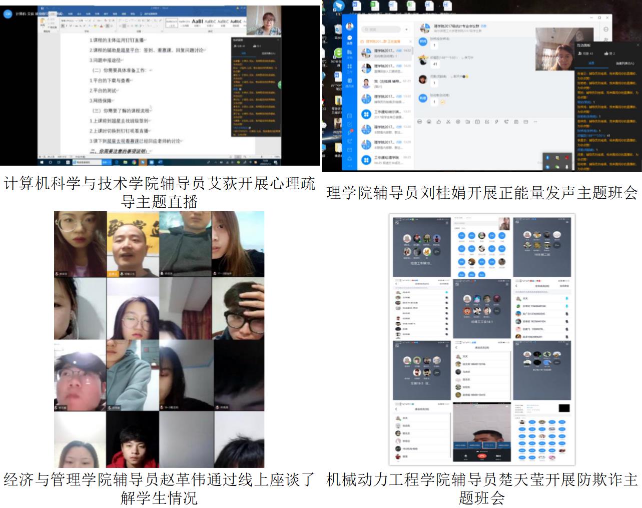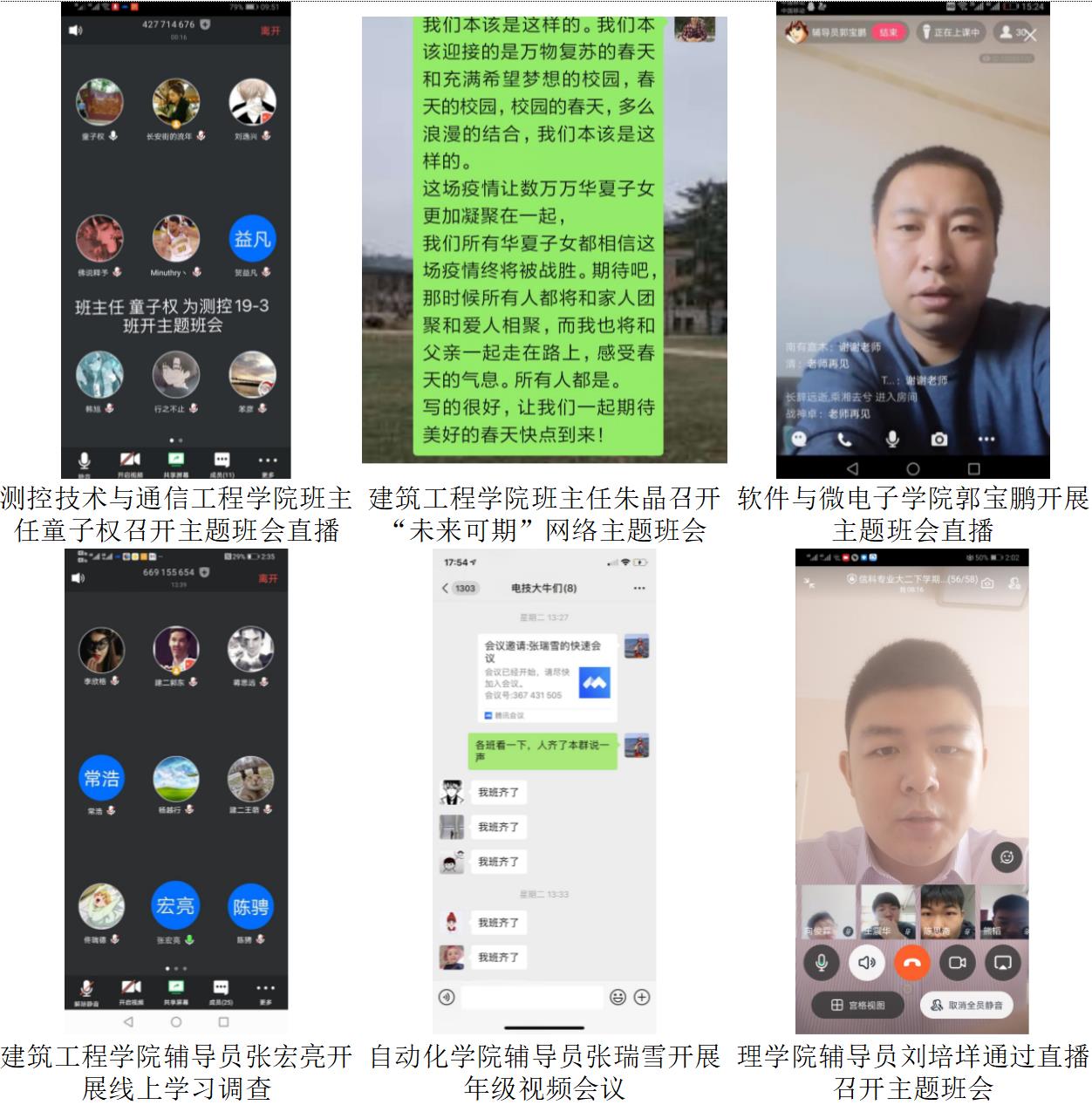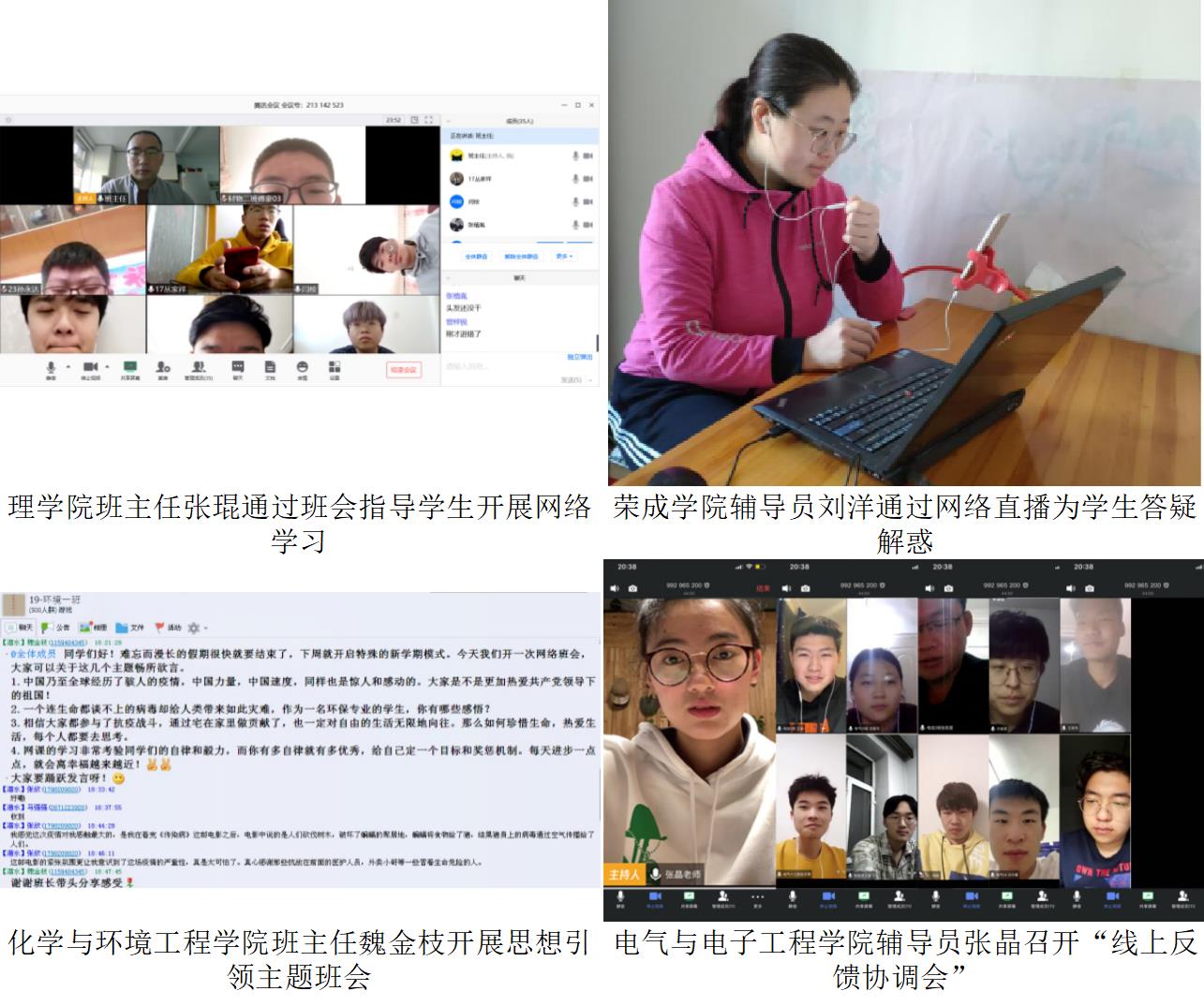躬身示范,“云思政”。辅导员通过网络班会、网络年级会、网络党团支部会、网络分享等途径,开启“云思政”模式,投入到疫情中的学生日常教育管理工作中,提醒教育、答疑解惑,引导学生合理安排宅家时光,调整作息时间,制定网络开学后的学习计划。
