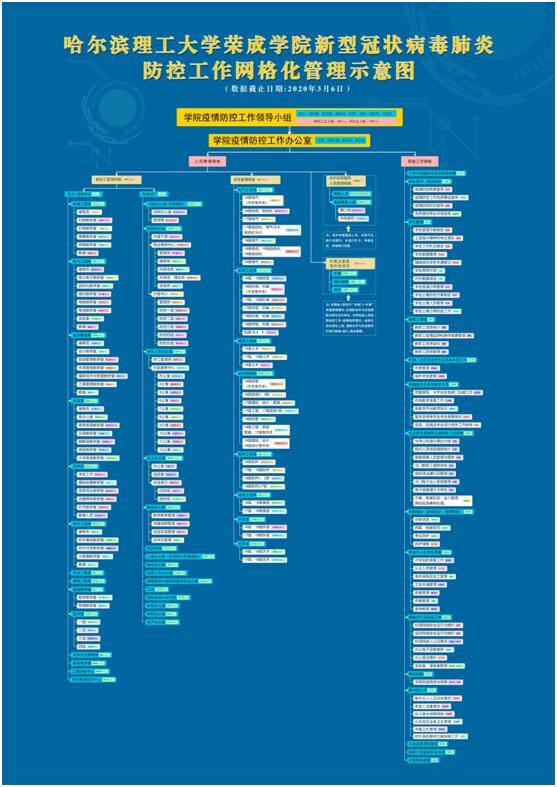 疫情期间,荣成学院在应对急难战“疫”中积极探索提升管理效能的实招,实行“疫情防控工作网格化管理”,把全院师生纳入自上而下分工负责的管理体系,打破部门工作壁垒,倡导多部门协同,划分为教职工、学生、校外经营服务人员以及外教和暂居海外师生等四类人群“人员管理网格”,和线上教学及质量督导、校园安全保卫及常住人员管理、消杀防护及物资储备、信息统计及宣传培训、网络安全维护等若干“职能工作网格”。教职工实行“人事办公室-部门-科室-工作组”管理;学生实行“学生工作办-系-辅导员-班主任-班级”管理;校外经营服务人员实行“后勤+资产运营管理中心”双主体管理;外教、暂居海外师生实行“本系部+外事”双重管理;每栋校内楼宇、每个商业单元均设一级网格,明确学院中层干部任一级网格长。由纪检监察室牵头,分级分层签订疫情防控责任书525份,压实主体责任,明确问责边界,实现盯防联防群防无死角、全覆盖。由学院办公室汇总,对已确诊、在湖北、有湖北逗留经停、与湖北籍人有接触、外地逗留或教学实习志愿服务、在国外境外、集中隔离和居家隔离、已返回荣成人员情况“日报告”学院疫情防控工作群,并梳理上级主管部门和驻地防疫工作会议文件精神“周传达”至学院疫情防控视频例会;对属地负责、网格管理中出现的疫情防控工作具体问题和推进情况,逐级报告、快速反映。学院注重从官方发布信息、网络平台留言、师生报告行动轨迹、部门报送信息报表中捕捉异常,与驻地疫情防控工作办公室、社区沟通了解情况,比对核实官方通报疑似病例与学院师生关联系数,主动发现并及时处置1例未如实报告的感染学生、1例不报告行踪且不配合居家隔离的临时工、1例拒不配合APP打卡的教师。