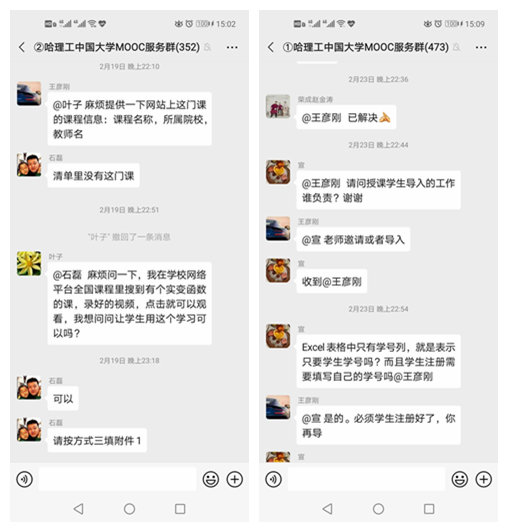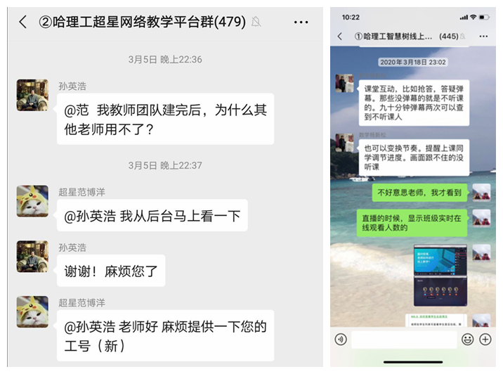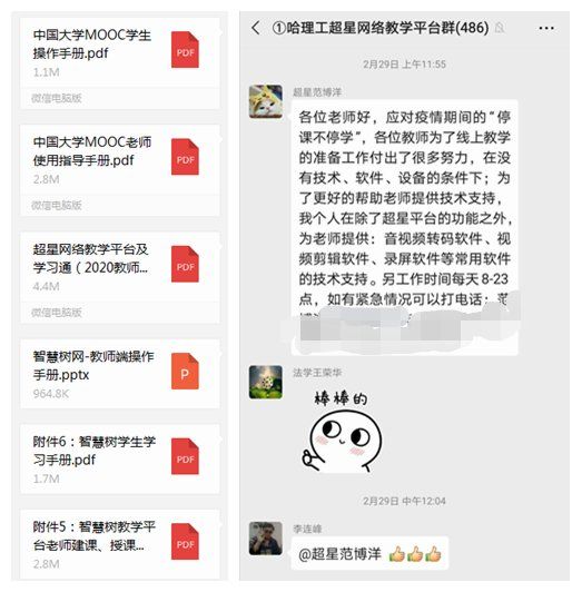 为了让教师们尽快熟悉并掌握平台使用方法,教务处加派工作人员加入培训群。他们先学一步,提前掌握平台使用技巧,并与平台技术人员一起为老师解决建课过程中的实际问题和困难;他们汇总并梳理老师们提出的问题,将共性问题统一解答,个性问题单独回复。为了及时回复群内教师提出的问题,各微信群负责人常常是“5+2”、“白加黑”的工作模式。有的老师忙起来半天都顾不上洗脸,有的老师在家里做家务、吃饭时也要经常停下来回复群内教师的提问,他们的敬业精神得到了群内教师们的多次点赞。