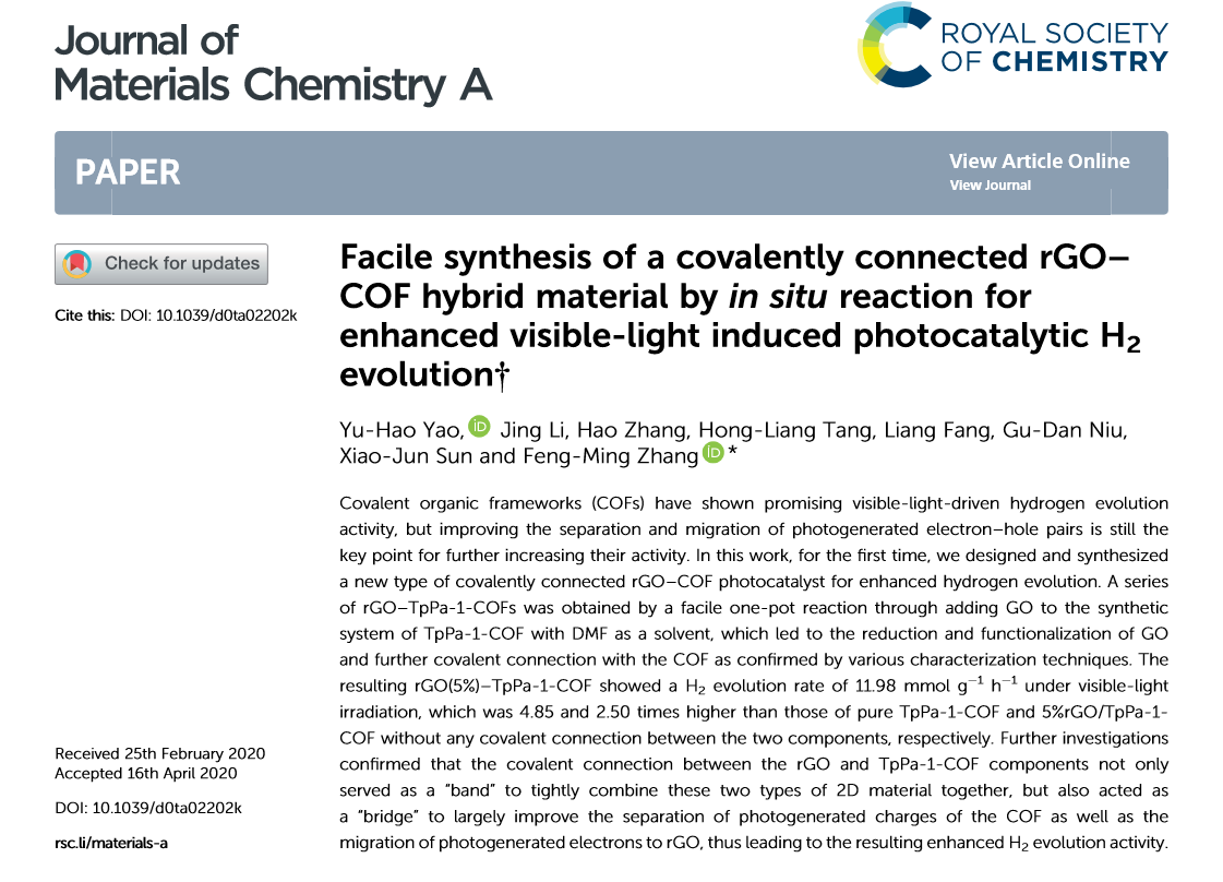 近日,永利官网化工学院材化16-1班姚宇豪(第一作者)等本科生为主要完成人在国际化学和材料科学领域著名期刊Journal of Materials Chemistry A(影响因子10.733)发表研究论文,并被期刊选为热点论文(hot paper),论文题目为:Facile synthesis of a covalently connected rGO–COF hybrid material byin situreaction for enhanced visible-light induced photocatalytic H2evolution (Doi:org/10.1039/D0TA02202K, 文章链接:https://pubs.rsc.org/en/content/articlelanding/2020/ta/d0ta02202k#!divAbstract),论文通讯作者为张凤鸣教授。该期刊属于英国皇家化学会旗下,是中科院SCI论文分区中一区Top期刊。这是我院本科生科研创新成果首次问鼎影响因子10以上高水平期刊,也为全校的本科生科研工作开创了先河。