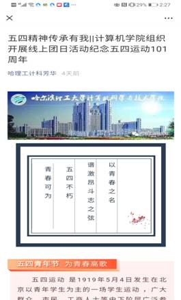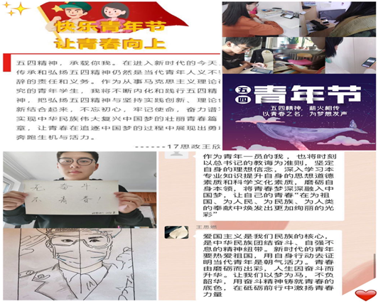 法学院团委开展与本学院防疫青年对话交流活动,利用黑龙江共青团公众号参与了“五四特别专辑”的团课学习。软件与微电子学院团委组织各团支部通过观看视频、主题演讲、诗朗诵等方式开展了以“弘扬五四精神,肩负历史使命”为主题的团日活动。同时,各班团支部书记作为主讲人介绍了五四精神的由来、历史背景及历史意义,带领班级团员青年重温“五四”历史。化学与环境工程学院团委开展了关于纪念““五四运动”101周年”网络系列主题活动之“爱国立行、青春记‘疫’”原创作品征集和“五四青年节总书记寄语新时代青年”学生学习心得分享的活动。作品类型有书画、文字和音频等形式并通过学院公众号进行了部分优秀作品和优秀心得的展示。