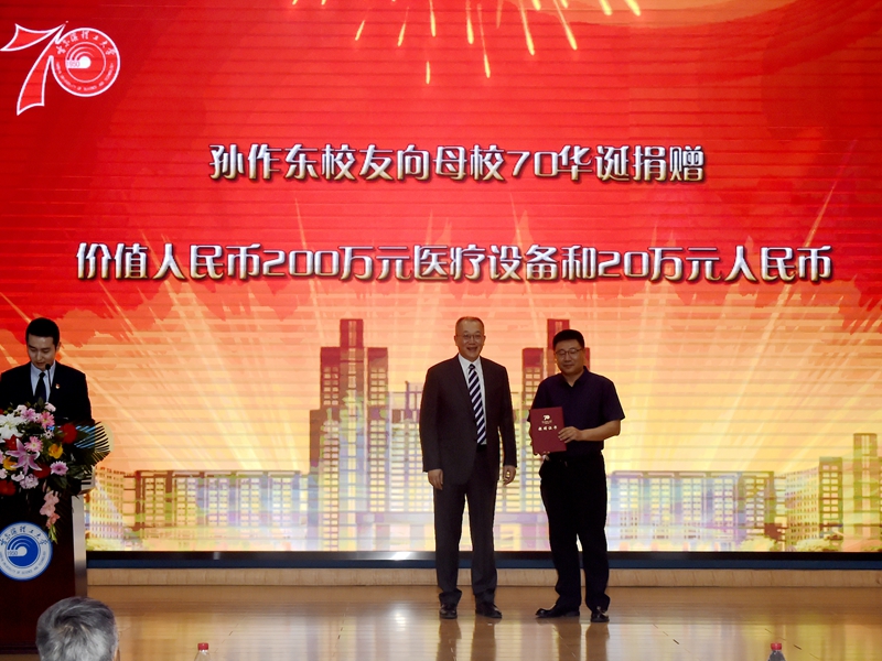在母校即将迎来70岁生日之际,机械85级校友、哈尔滨奥博医疗器械有限公司董事长孙作东向母校捐赠了价值人民币200万元的康复治疗仪器及20万元人民币。校长赵琳向孙作东校友颁发捐赠证书。孙作东校友在致辞中说:“天涯地角有穷时,只有师恩无尽处;饮其流者思其源,学其成时念吾师。相信母校一定会在学校领导的正确带领和全校师生的共同努力下,爬坡过坎,大踏步向全国知名高等学府迈进。”