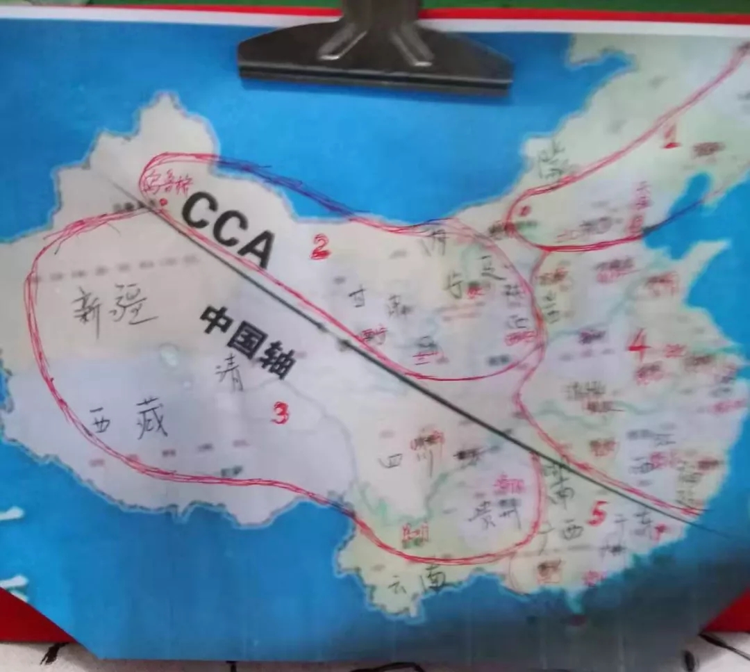 60年后的今日,我通过连续多年观察记录全世界地震、台风、龙卷风、暴风雨及火山爆发等极端气象事件,认为它们可以归类成地球释放能量,只是表现形式不同而已,并保持动态平衡,且对称于各中国轴。中国(本土)轴,Chinese China-Axis ,CCA就是一例。它已被中科院院士丁一汇认定为雨带,且被中央气象台作为雨带(隐性)引用于早晚两次天气预报中。中央台晚上天气预报分块如下:1.东北块:哈尔滨,长春,沈阳,天津,北京及呼和浩特;2.西北块:乌鲁木齐,银川,西宁,兰州及西安;3.西南块:拉萨,成都,重庆,贵阳和昆明;4.东部块:太原,石家庄,济南,郑州,合肥,南京,上海,武汉,南昌,杭州,长沙及福州;5.粤南块:南宁,广州,海口,香港和澳门。以上五块分别位于中国轴,CCA两侧的北、北、南、北、南。由早,晚两次预报可以看出,这些专家默认中国地图上有此分界线,因此在科学气象块报导中不跨越此线。气象预报中鼠标移动次序如下图: