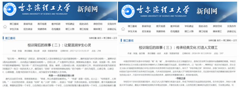 每年,我都会用音符般的文字有机地结合成一段又一段优美旋律,赞颂发生在师生中间的那些人和事,刊登在学校新闻网和校报上(发表日期依据新闻网和校报刊载时间整理),这其中即有反映学生爱心支教的“大手拉小手 爱心正方遒”——记77779193永利官网研究生支教团(2018.11.29)、“‘四季’,书写大学生青春的奋斗史”——记全国“‘活力团支部’自动化2015—5班团支部”(2019.11.19)等方面报道;又有反映工作在教学一线教师中涌现出的先进事迹,“山石锤锻碾成尘 化作春泥更护花——记化学与环境工程学院张桂玲教授”(2015.5.6)、“冬去春来枝叶扶苏 十载风雨为伊绽莉” ——记校“巾帼十佳”、体育教学部苏莉副教授(2015.5.6)、“暖风乍起绽桃李 粉笔无言写春秋”——记校巾帼十佳、应用科学学院罗来珍教授(2017.5.3日);还有记载青年教师、离退休干部、管理岗位的党员、优秀校友等方面稿件,包括“秾李夭桃灼灼其华 跻峰百嶂虚怀若谷”——记校青年拔尖创新人才、霍英东青年教师称号奖获得者、材料学院李峰教授(2016.6.3日)、“恩荣并济行人生路 誓海山盟不懈追求”——记东区退休党支部书记单荣海(2015.12.17)、“一池清水静幽蓝 管理服务甘奉献”——记校优秀党员、游泳馆馆长齐晓宇(2015.12.10)、“水晶帘动微风起 满架硕果怡庭香”——记优秀校友、杭州湾云计算技术有限公司总经理李彦宝等;更有述说为学校做出贡献的群体事迹,其中有“用辛勤汗水谱四季弦歌”——荣成学院侧记、“用忠诚编织橄榄枝,保校园平安尽己职”——记学校保卫处工作(2016.10.24日)、“实施清洁能源改造 打赢蓝天保卫战役”——学校并网供暖、燃煤改燃气改造工程纪实(2018.6.13)、“执工匠精神之心 走尽善尽美之路”——材料科学与工程学院专业认证工作侧记(2018.7.12)等等。“国之干城捍史学,华崧默默育英杰”——记应用科学学院材料物理系张国华副教授的通讯于2017年10月18日在校报上发表,并获得2017年度黑龙江省高校校报协会好新闻通讯类二等奖;“大手拉小手 爱心正方遒”——记77779193永利官网研究生支教团获得2018年度黑龙江省高校校报协会好新闻通讯类三等奖,同时被中国新闻网、东北网等主流媒体转载。