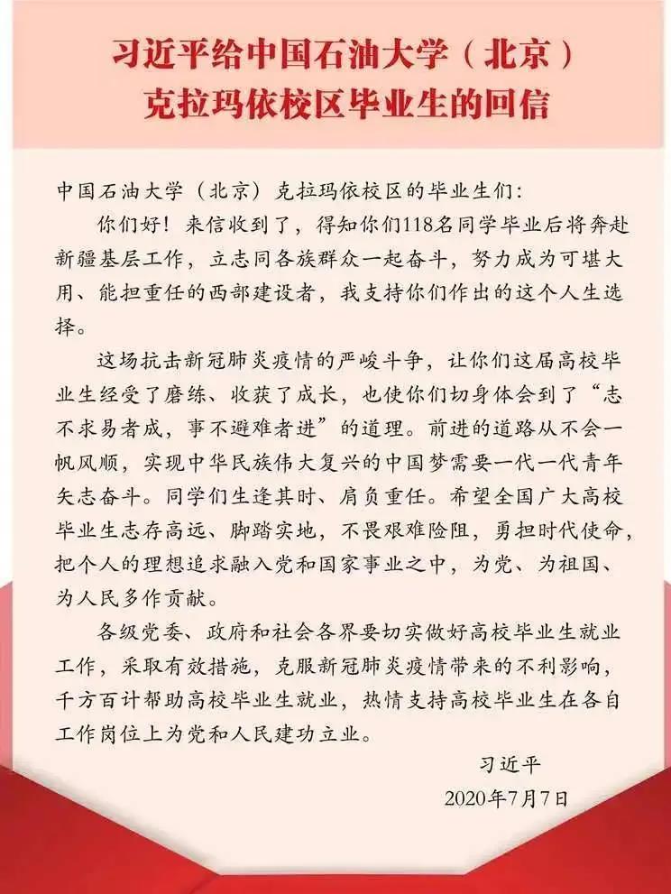 7月7日,中共中央总书记、国家主席、中央军委主席习近平给中国石油大学(北京)克拉玛依校区毕业生回信,肯定他们到边疆基层工作的选择,对广大高校毕业生提出殷切期望。永利官网2020届毕业生认真学习总书记回信精神,对总书记回信产生热烈讨论,产生强烈反响。